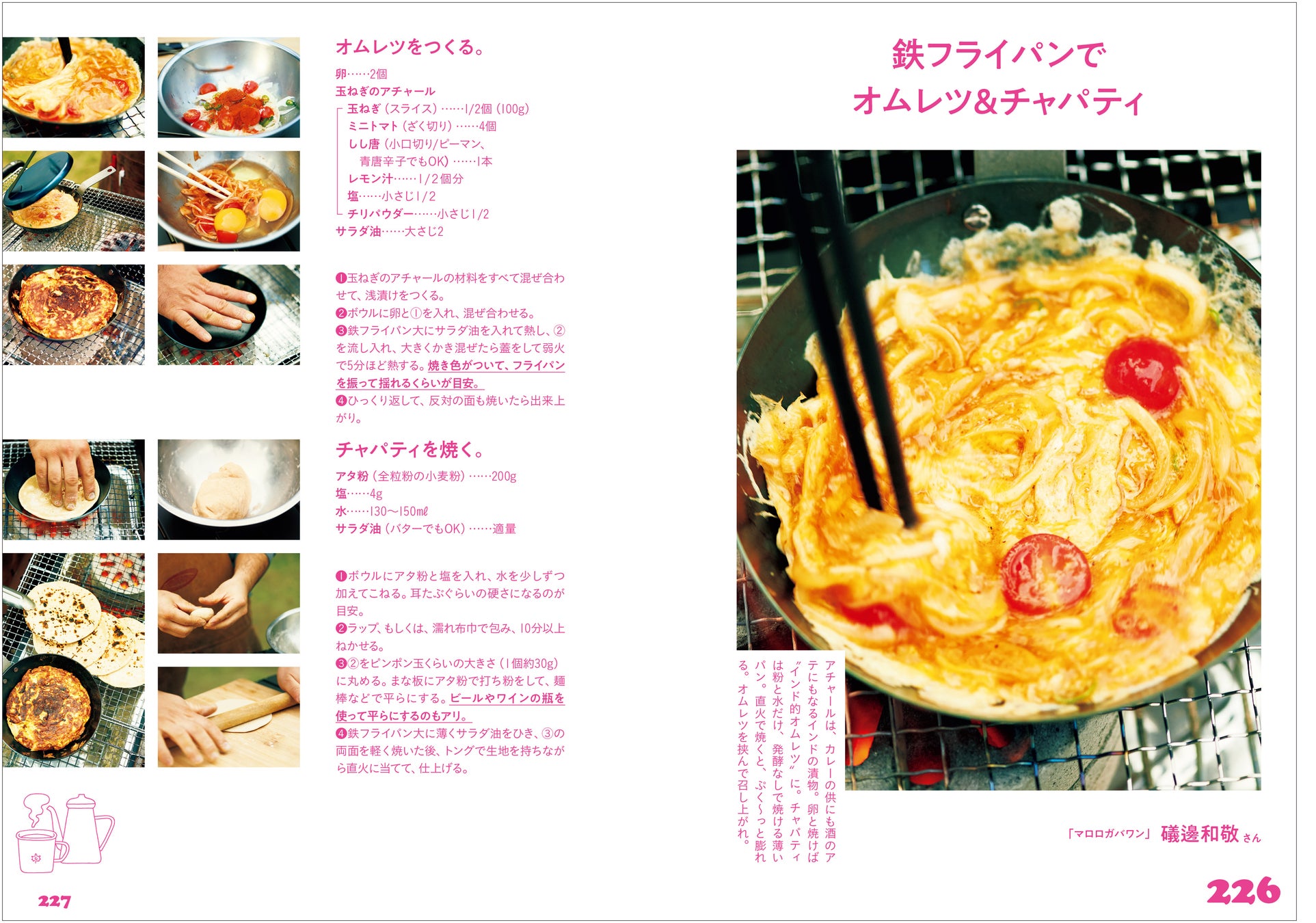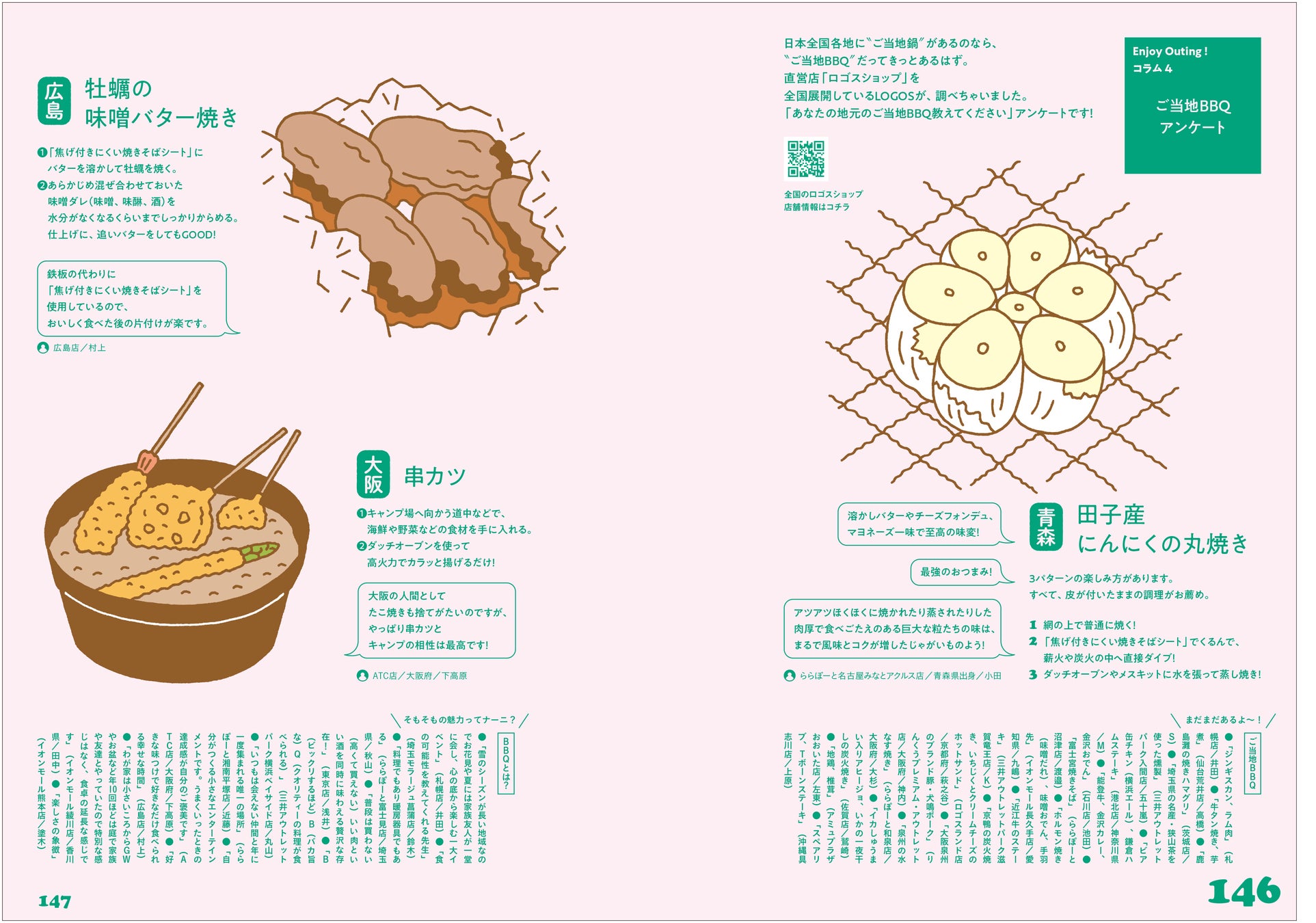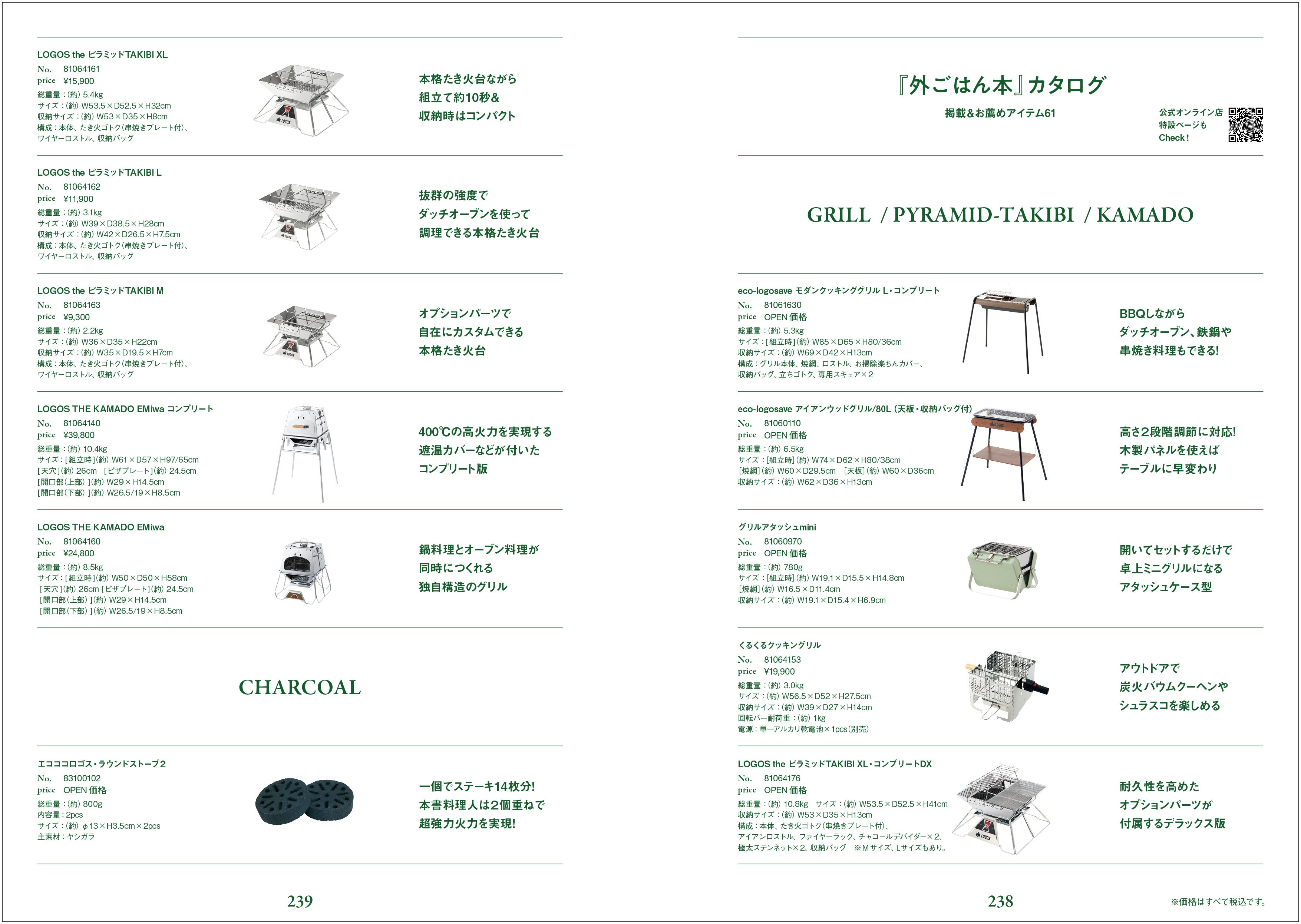 さらに、本書内のレシピで使用したアイテムに、LOGOSがおすすめするアイテムをプラスして紹介する巻末カタログも収録されており、アウトドア経験者の方が楽しめるだけでなく、キャンプ初心者の方が外ごはんに挑戦する時にも参考にできるような、盛りだくさんの内容です。