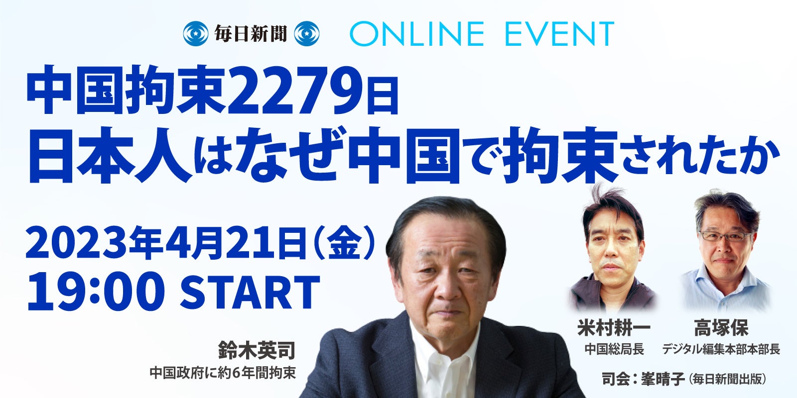 毎日新聞社(社長:松木健)は4月21日(金)19時から、「中国拘束2279日 日本人はなぜ拘束されたのか」と題し、中国政府にスパイ行為をしたとして6年間拘束された元日中青年交流協会理事長の鈴木英司氏が登壇するイベントを日本プレスセンター(東京都千代田区)で開催します。中国での取り調べや拘置所の様子について、釈放されて日本に帰国した当事者の口から明かされる極めて稀な機会です。オンラインによる同時配信も行います。ぜひご参加ください。