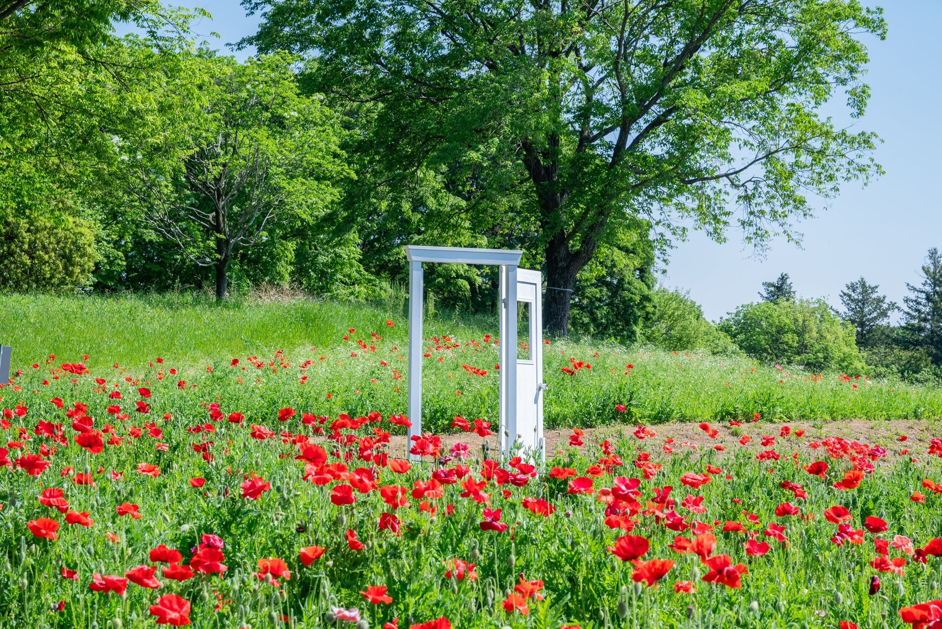 ②毎年人気の「白いドア」は、シャーレーポピーの赤に映える白色となっており、物語の世界へとつながるような存在感を放っています。