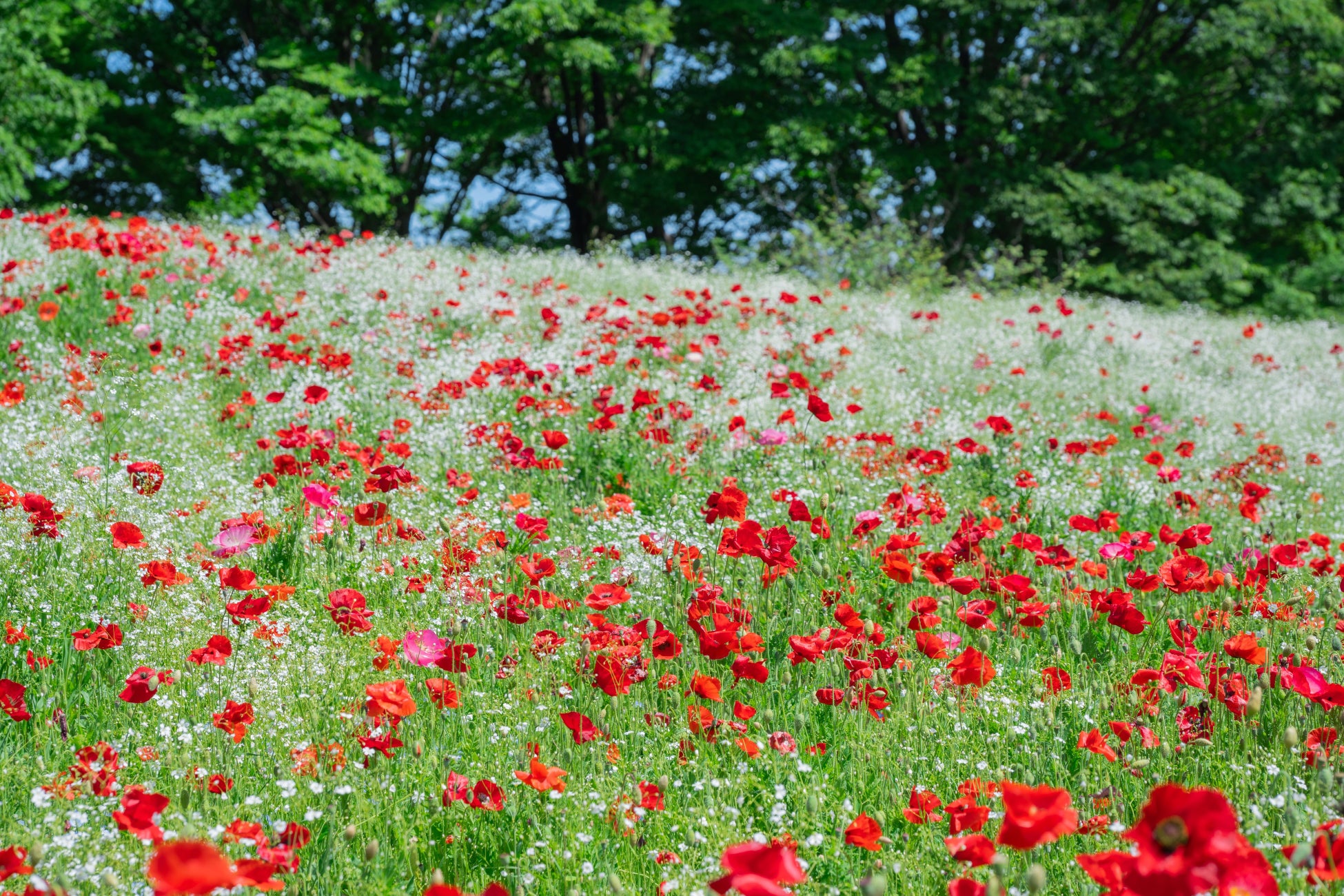ネモフィラのやさしい青から、シャーレ―ポピーの鮮やかな赤へと移り変わる春のグラデーション。昭和記念公園ならではの花の開花リレーを、ぜひご体感ください。