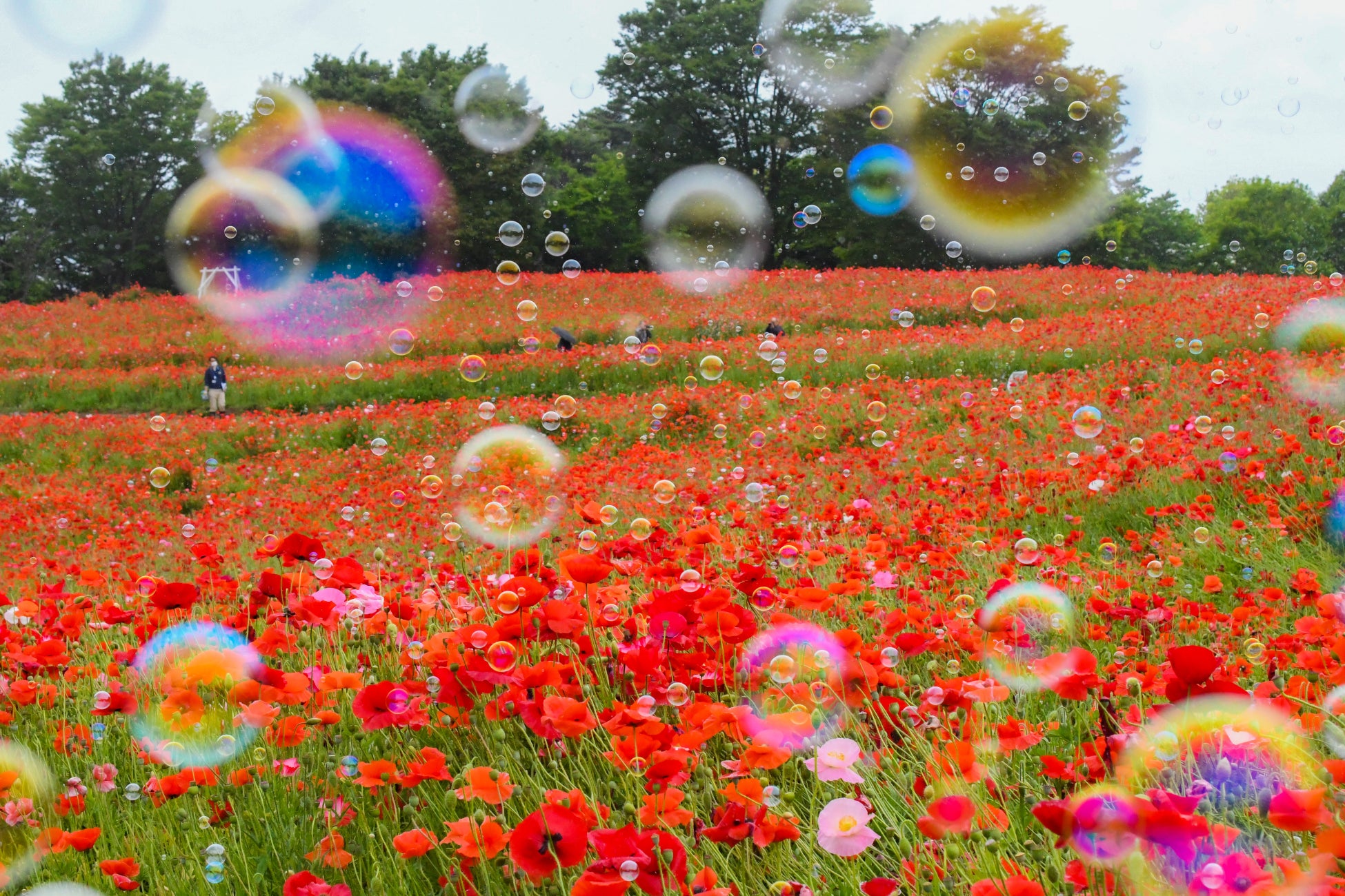 シャボン玉が花畑に浮かぶ幻想的な光景をお楽しみいただけます。