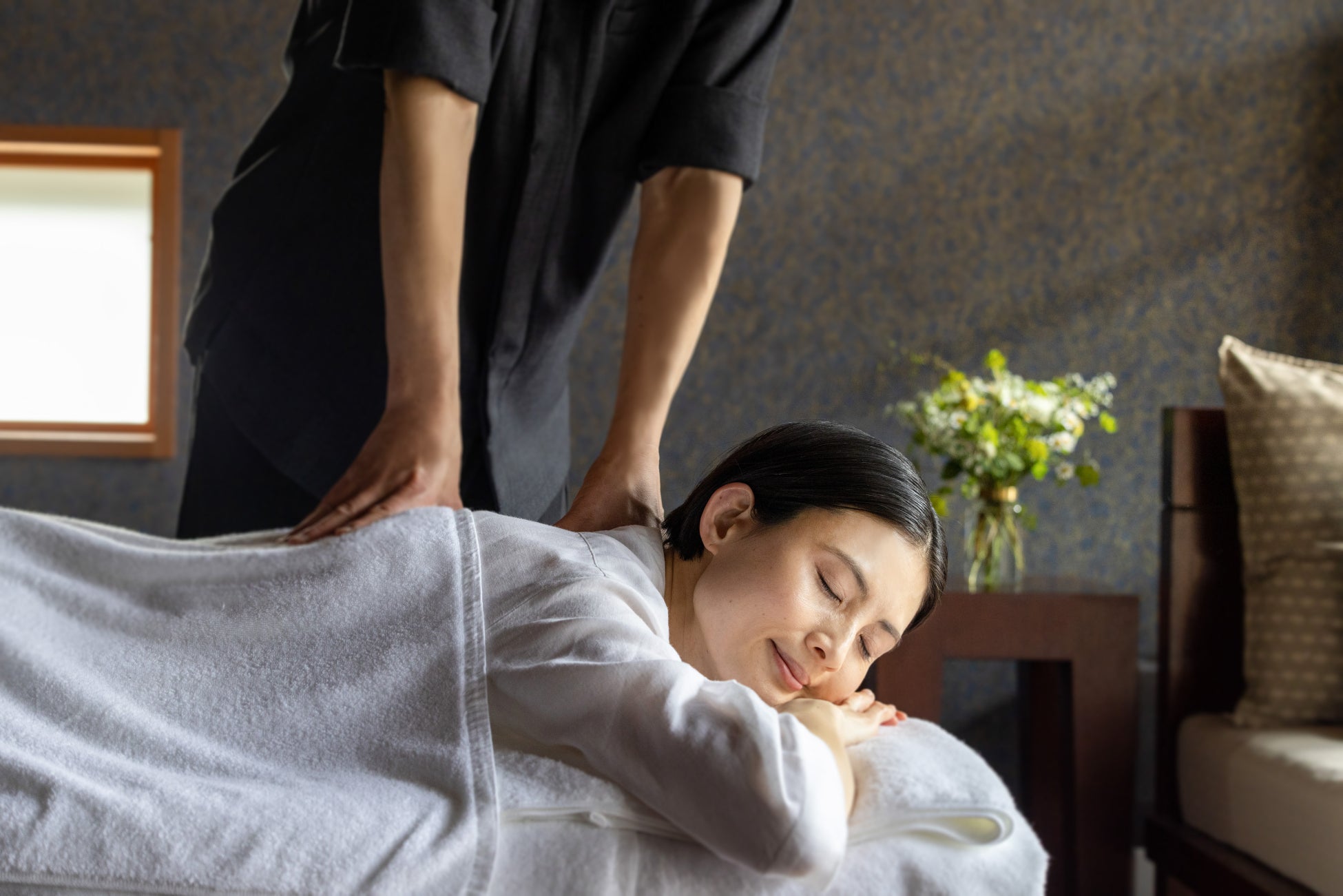 到着後、自身では気づきづらい不調によって凝り固まった身体をほぐすため、国家資格を持つ星のや軽井沢専属のあんま指圧マッサージ師による施術を行います。先ずは、個々の身体のバランスを把握するコンサルテーションを行い、胸郭の動きと姿勢の状態を確認します。日常生活を送る中で、不自然な姿勢や習慣により、緊張状態にある全身の筋肉を緩める施術です。日常生活へと戻った後も快適に過ごせるように導きます。