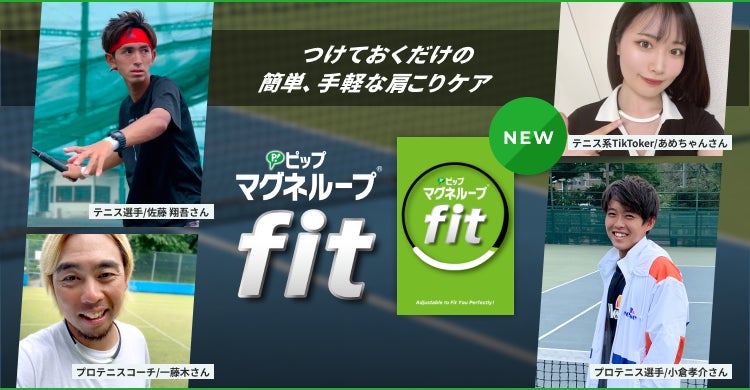 この夏「ピップマグネループfit」は、『佐藤翔吾さん(YouTube)、小倉孝介さん(YouTube)、一藤木良平さん(YouTube)、あめちゃん(TikTok)』のインフルエンサー4名とコラボし、肩コリに悩むテニスプレイヤーを応援する企画を実施します。