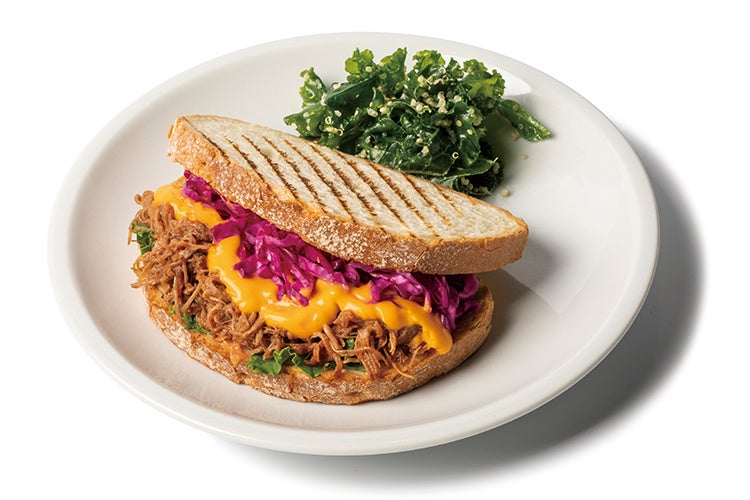 ホットサンドには、アメリカの家庭料理「プルドポーク」を挟み、ご注文ごとに香ばしく焼きあげます。ほろほろに煮込んでバーベキューソースを絡めた豚肉の旨みに、チェダーチーズのコク、そして酸味のきいた赤キャベツのマリネが程よいアクセント。定番のデリ惣菜「ケールサラダ」も添えました。お持ち帰りも可能です。