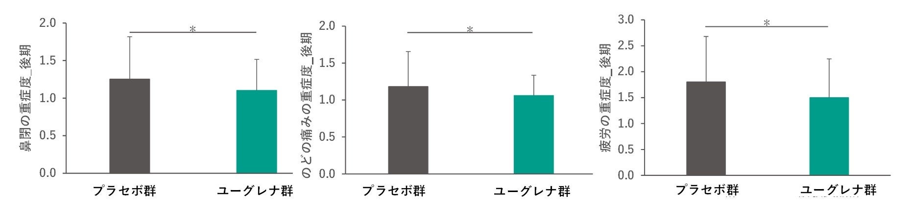 その結果、プラセボ食品摂取群と比較して、ユーグレナ含有食品摂取群では、8週間中に感冒症状(かぜ様症状)があらわれた日の累積日数※7が有意に少なくなりました(図 1)。また、感冒症状(かぜ様症状)の中でも特に鼻閉、のどの痛み、疲労などの個別の症状における摂取5週目から摂取8週目の4週間中の重症度※8においても、ユーグレナ含有食品摂取群の方がプラセボ食品摂取群よりも有意に低くなりました(図2)。