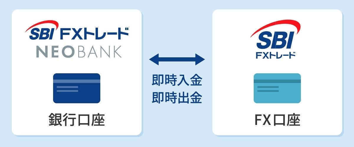 「SBI FXトレードNEOBANK」口座とSBI FXトレード口座間で即時の入出金がご利用いただけるため、スムーズなお取引が可能となります。