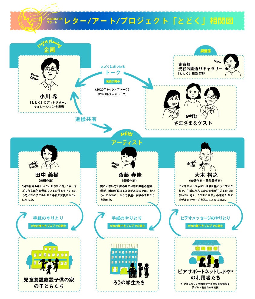新型コロナウイルスの感染拡大以降、私たちは、それ以前とは異なる新たな日常を生きています。他者との交流は、SNSやZoomなどのオンラインツールが頻繁に使用され、簡単に遠方の人と繋がることが当たり前となりました。そんな世の中になった今、あえて「手紙」などの時間がかかる手段で多様なバックグラウンドの人たちとアーティストがコミュケーションを取り合い、共同でアート作品を作り上げていくアートプロジェクトを2020年12月にたちあげました。ゲストディレクター/キュレーターにArt Center Ongoingの代表である小川希を、また、アーティストには、大木裕之、齋藤春佳、田中義樹を招聘し、2023年3月まで交流を続けます。