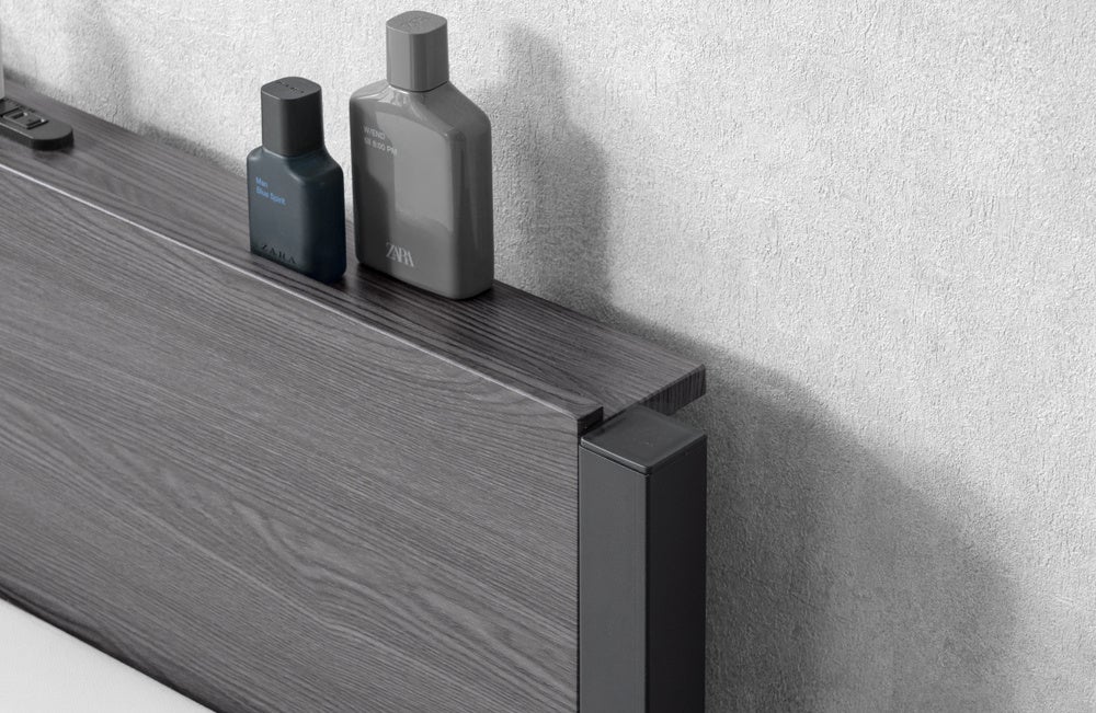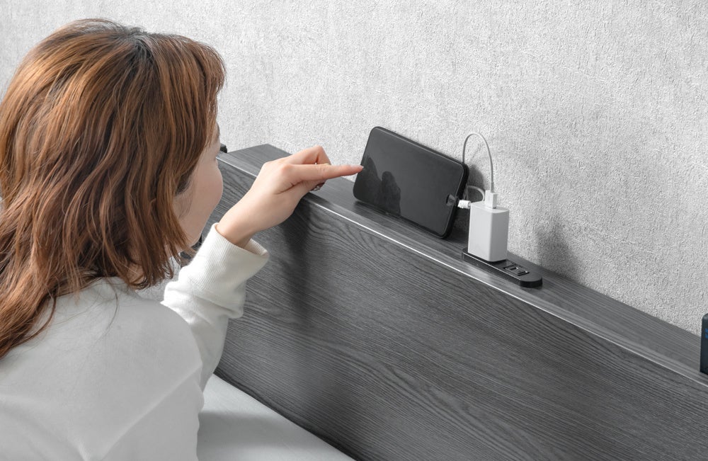 充電しながらスマホを立てかけたり、お気に入りの小物を飾ることができる宮棚が付いています。コンセントは埃の侵入を防ぐスライドカバー付きとなっているので、安心してご使用いただけます。