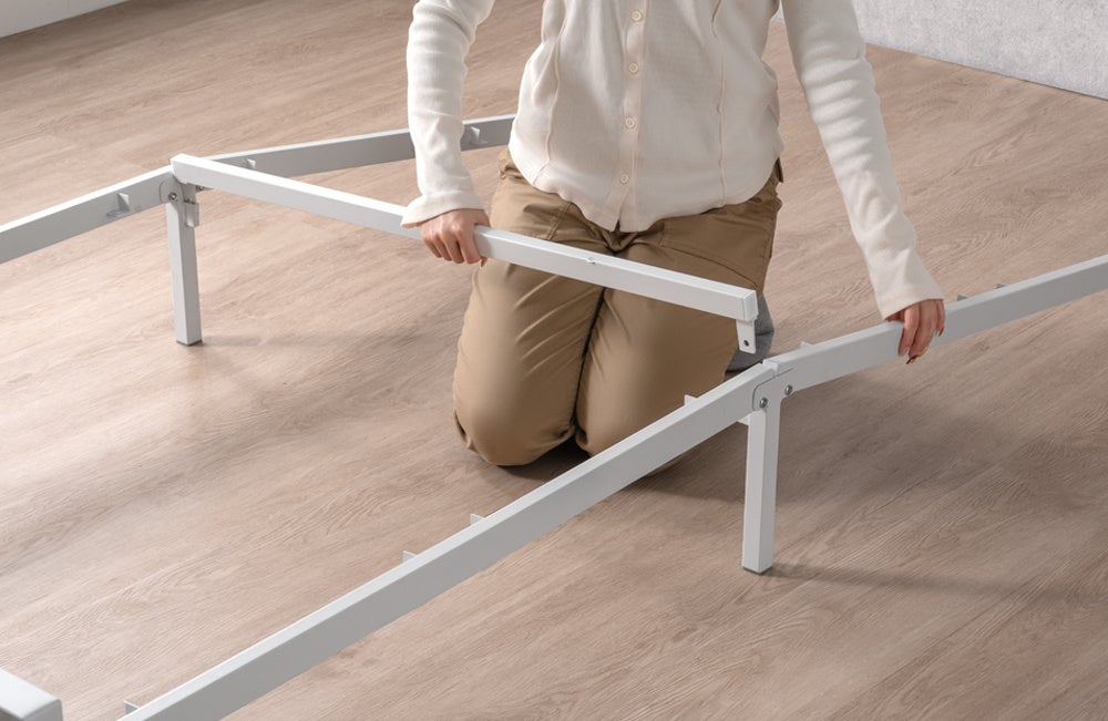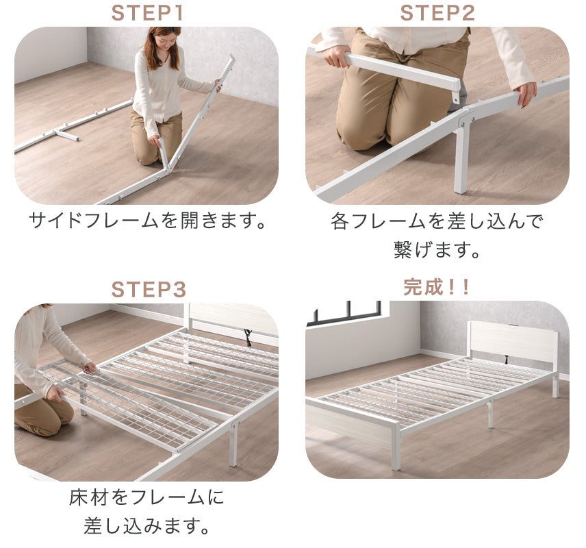 本製品は、パネルやフレームを差し込むだけで完成するスチールベッドです。差し込むだけなので組み立てができ、工具を使用しないため、組み立てが苦手な方でも簡単にベッドを完成させることができます。