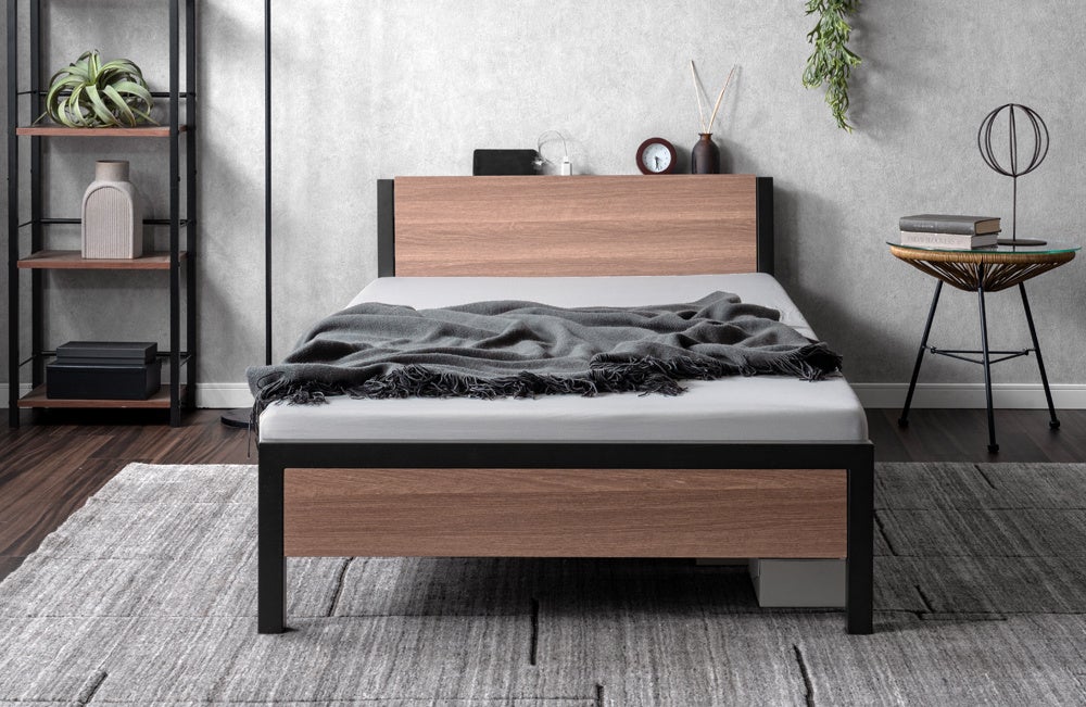 スチールのフレームに木目調のパネルを合わせたベッドです。シンプルなデザインなのでどんなお部屋にもあわせやすいデザインになっています。