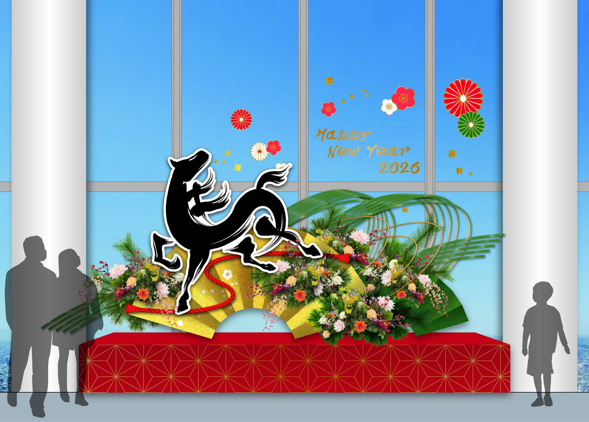 東京スカイツリーの展望台には、天候が良ければ富士山を見ることができる眺望と一緒に、年賀状のような写真が撮れるフォトスポットが登場するほか、力強く躍動する”馬”のパネルと、和を連想させる扇子の装飾や色鮮やかな花々で新年「午年」をお祝いする装飾を設置します。