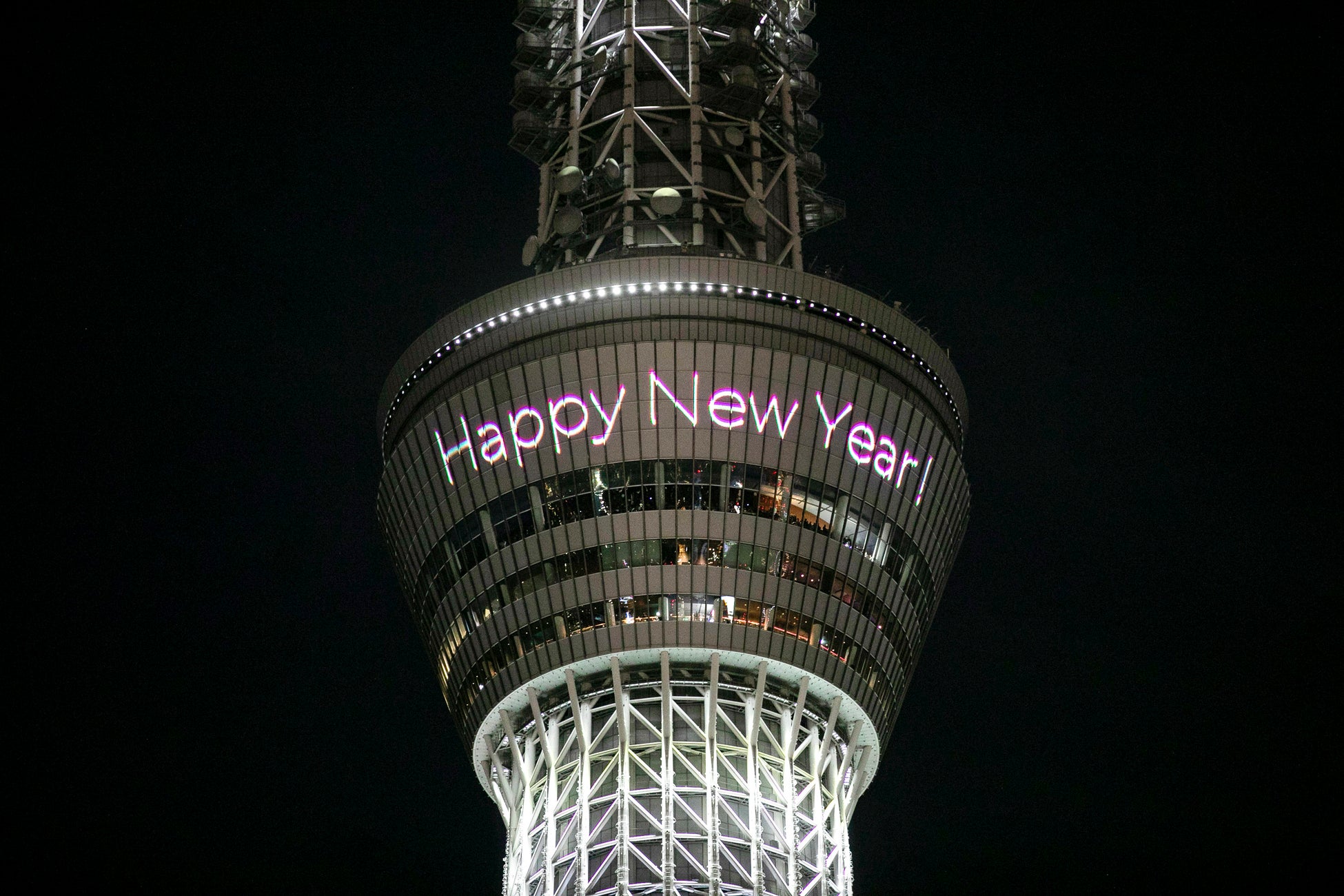 東京スカイツリーでは、新たな気持ちで新年をお迎えいただきたいという想いを込めて、日本国旗をイメージした新年特別ライティングを点灯するとともに、地上350メートルの天望デッキの上部に「Happy New Year!」と新年のメッセージをレーザーマッピングにて投影します。
