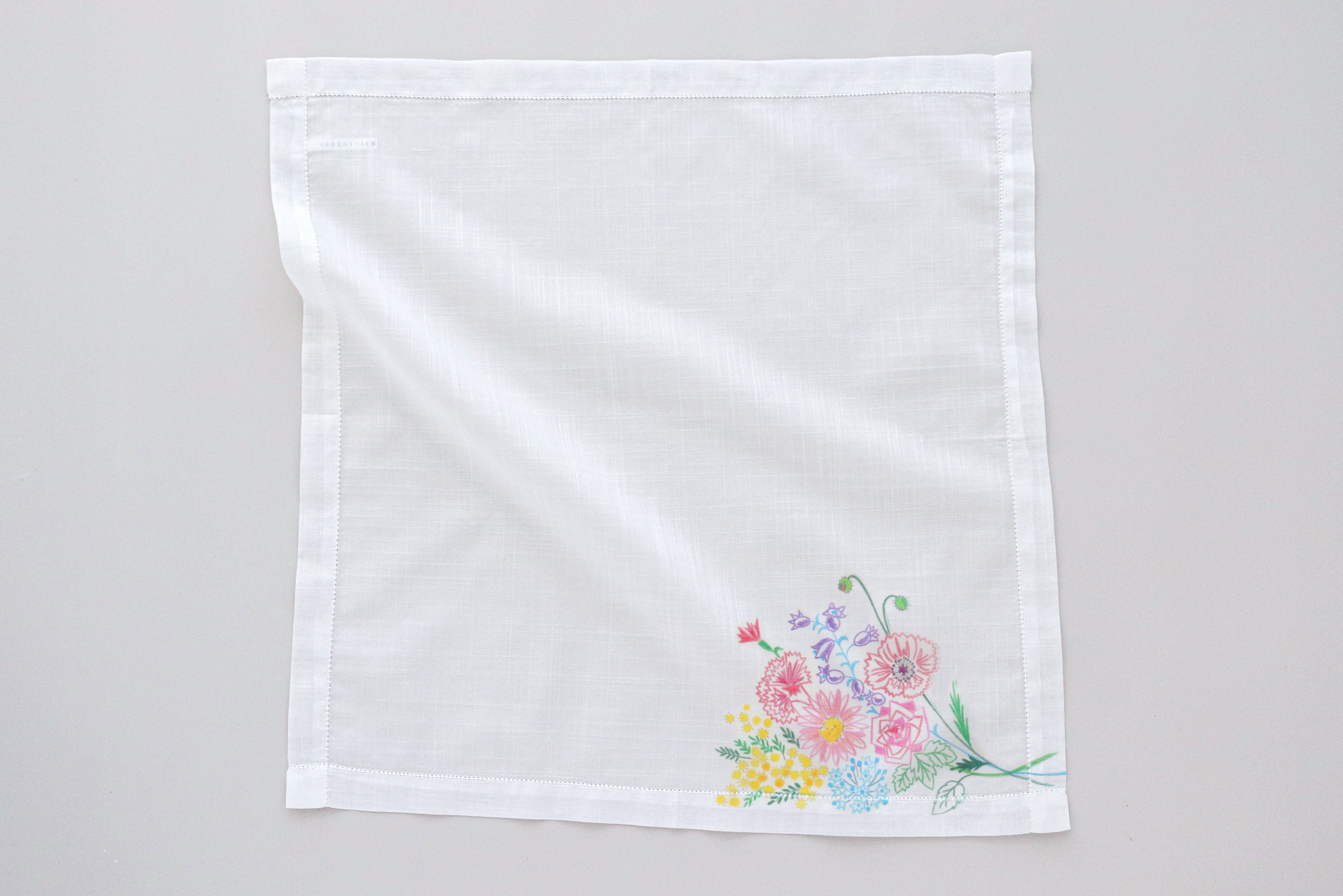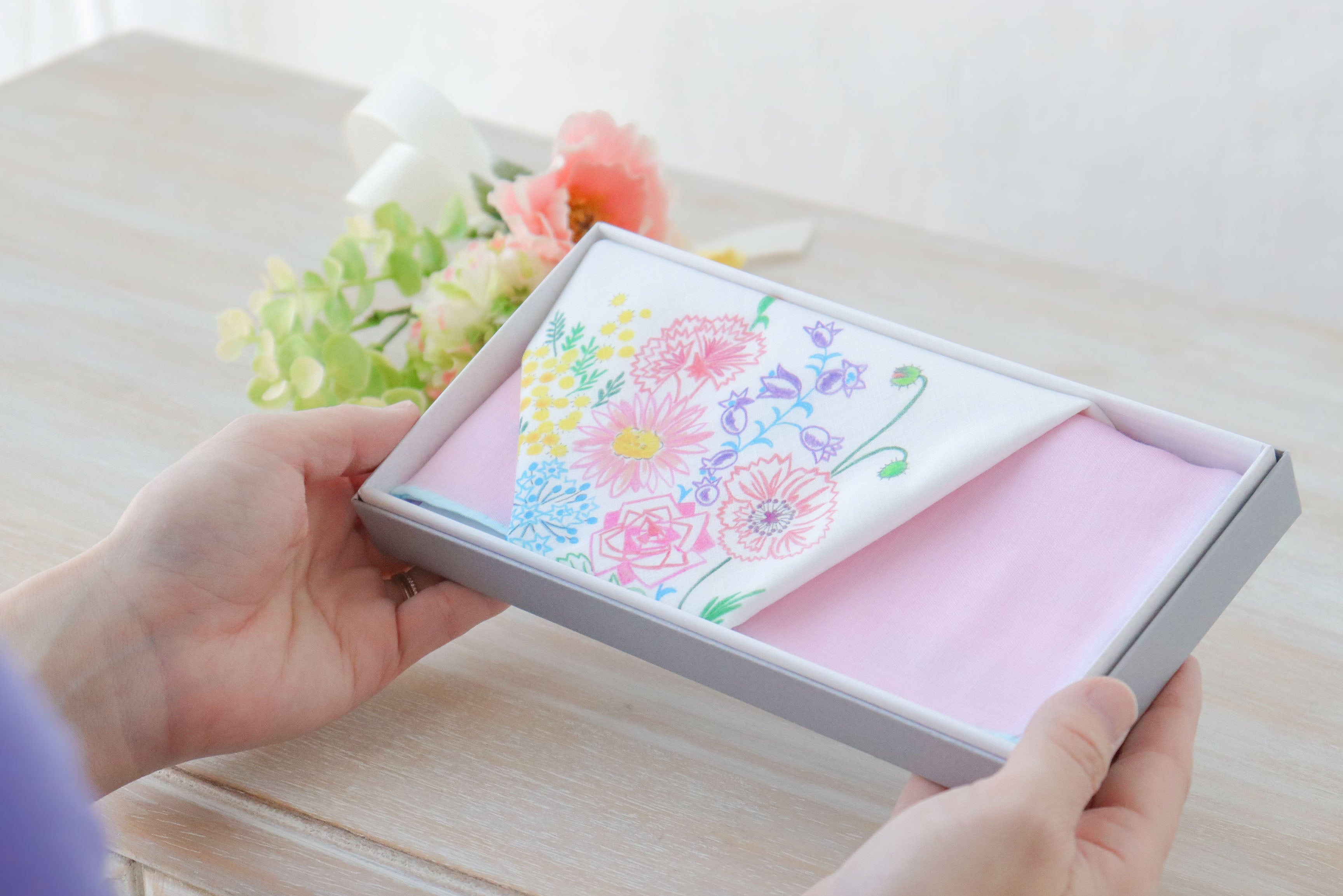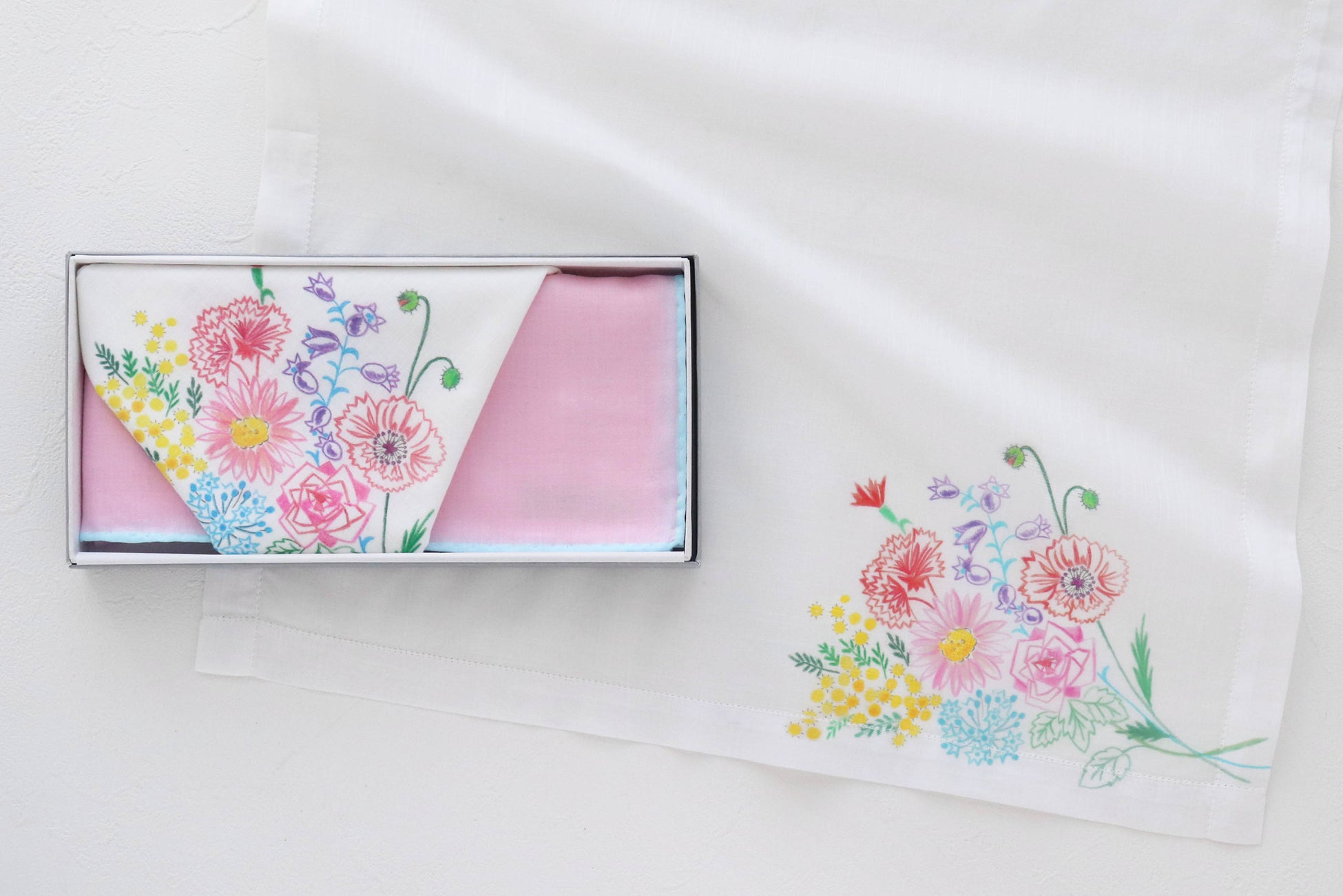 「ありがとう」の花言葉を持つ、ピンクのバラ、カーネーション、レースフラワー、ピンクのガーベラ、カンパニュラ、赤いポピー、ミモザと7種を花束にし、手描きの温もり感あるタッチでハンカチーフにプリントしました。感謝の気持ちがこもったハンカチーフです。