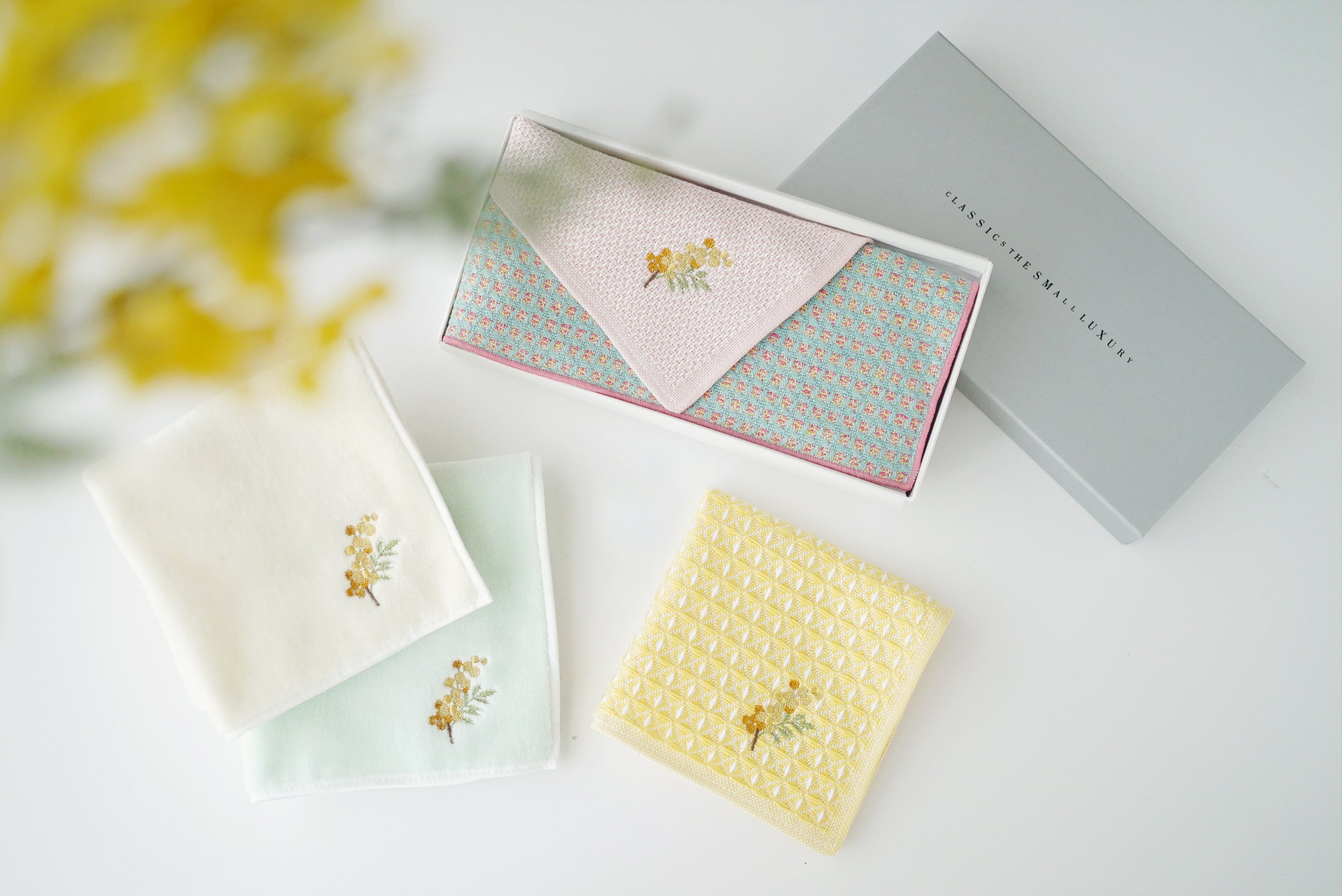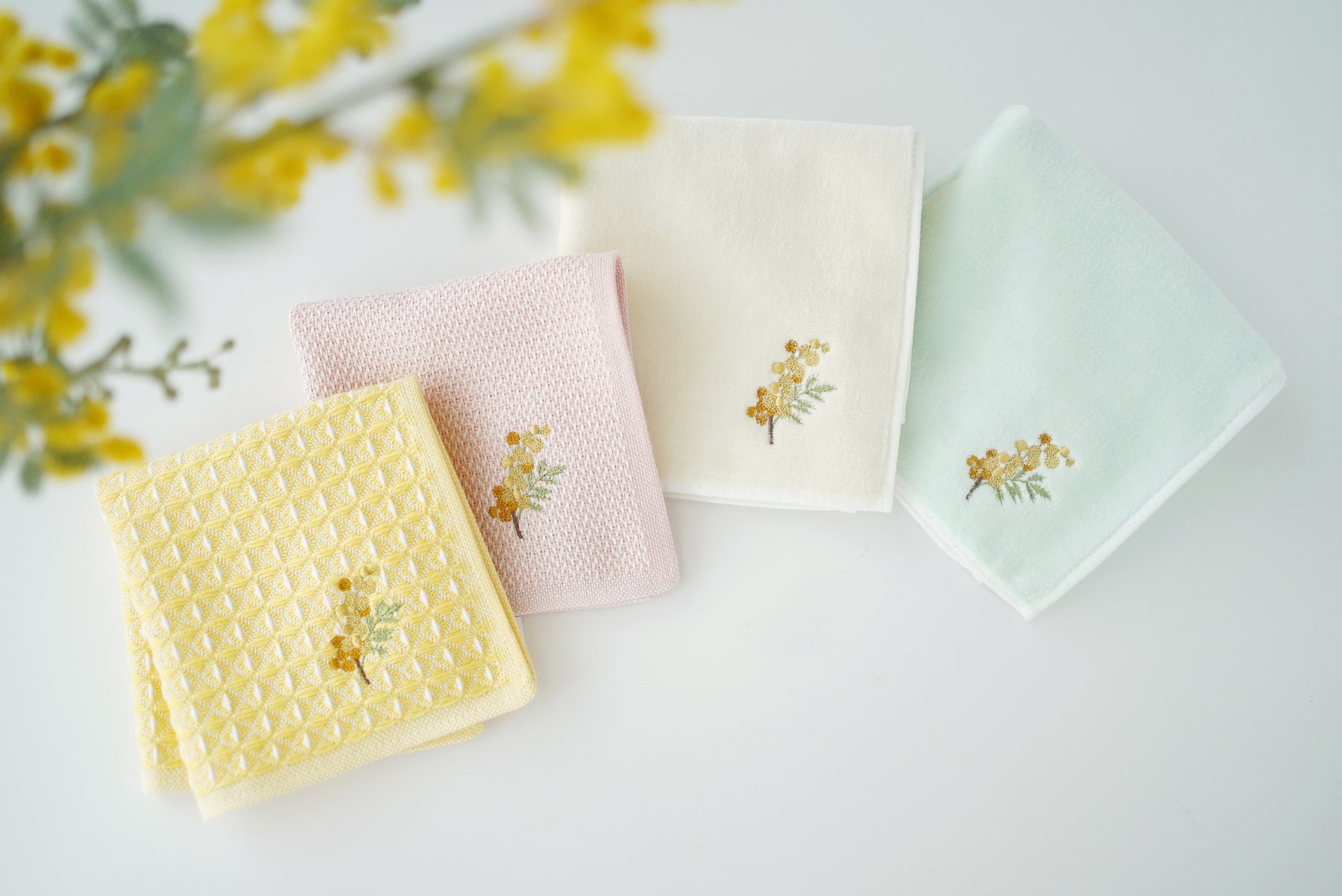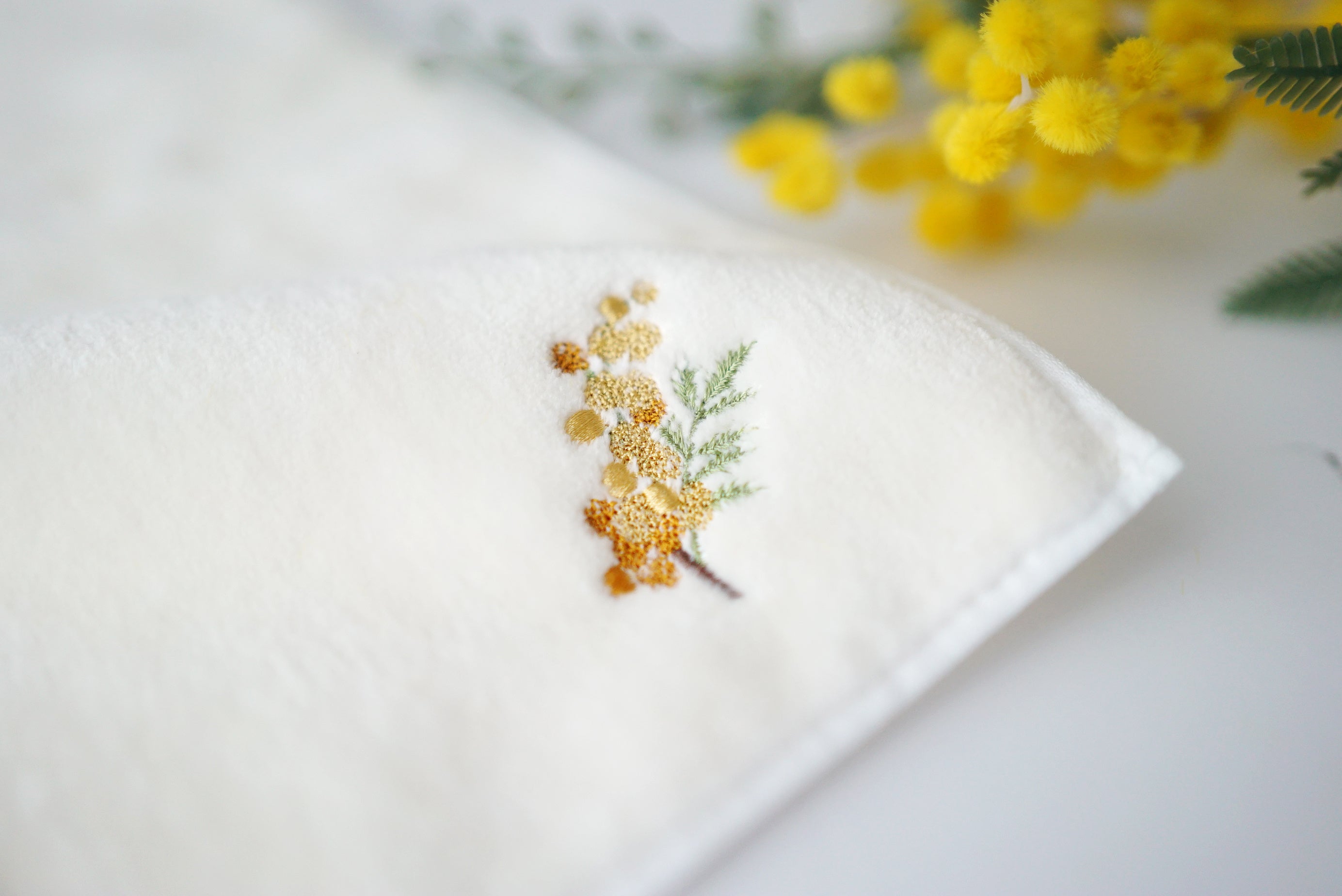 ミモザの花をワンポイント刺繍したシリーズ。オンラインショップでは、ミモザ刺繍の黄色が映える5タイプのハンカチーフをセレクトし、刺繍を施した商品を販売します。この時期ならではの特別なハンカチーフは、贈り物にもおすすめです。