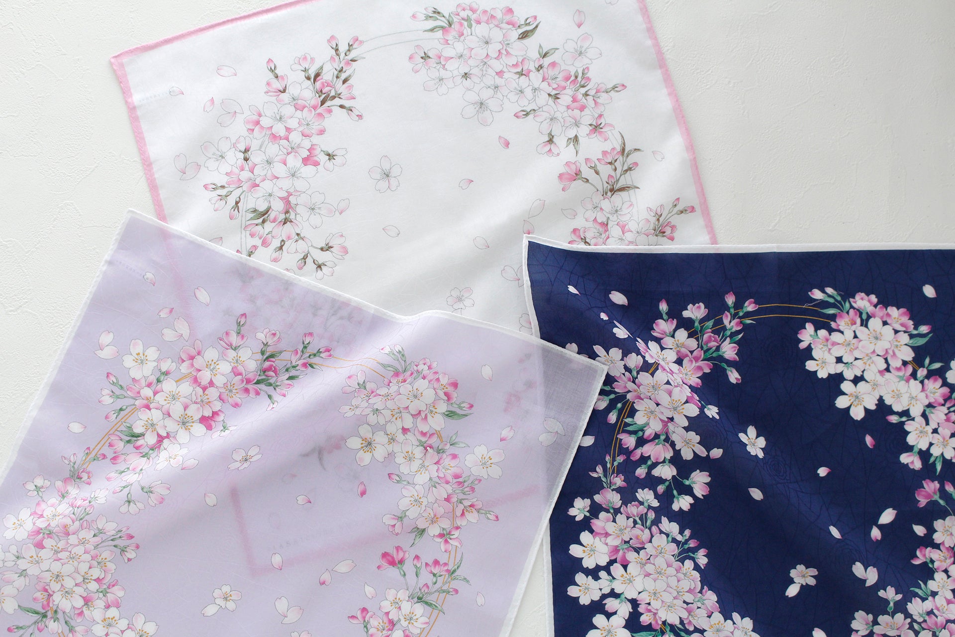 満開に咲き誇る桜の花を楕円のリースにし、水彩タッチで淡いピンクの優しい桜を描きました。リースの円は"永遠のシンボル"、"幸運のお守り"の意味もあります。幾何学模様のローズ柄の高級感のあるジャカード生地を使っています。新生活を迎える記念のプレゼントに最適な一枚です。この春、新色ネイビーが加わります。