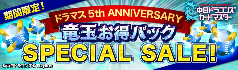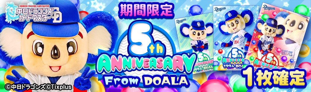プロスポーツチームやリーグ向けのデジタルトレーディングカードサービスを開発、運営している株式会社Tixplus(本社:東京都渋谷区、代表取締役:池田 宗多朗、以下Tixplus)は、中日ドラゴンズ公認のスマートフォン向けカードコレクションアプリ「中日ドラゴンズカードマスター(略称:ドラマス)」において、サービス開始より5周年を記念し「5th ANNIVERSARY From DOALA」カードをリリースいたします。