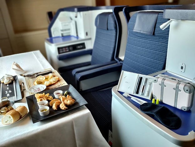 ご宿泊いただく客室は昨年誕生したANA国際線ビジネスクラスで現在使用されているものと同型のモックアップシートを2台設置した「プレミアフライヤーズダブルルーム」と2007年に誕生した国際線で実際に使用されていたファーストクラスシートを1台設置した「プレミアフライヤーズツインルーム」の2室をご用意。フライトの気分を味わえるようにとそれぞれ窓側に設置しており、正面に飛行機が駐機するとパイロットの姿を見ることもできます。さらに数量限定でANA国際線ファーストクラスにて提供されているアメニティポーチもご用意いたしました。ANAオリジナル「グローブ・トロッター」ポーチにザ・ギンザ エッセンスエンパワリングセット、ハブラシセット、アイマスク、イヤープラグが入ったセットです。