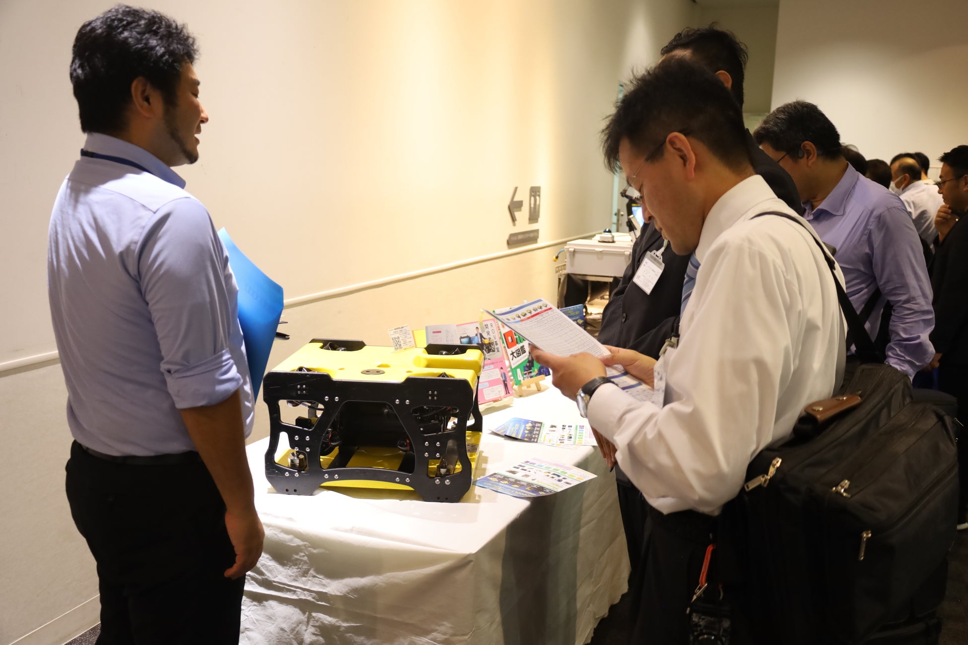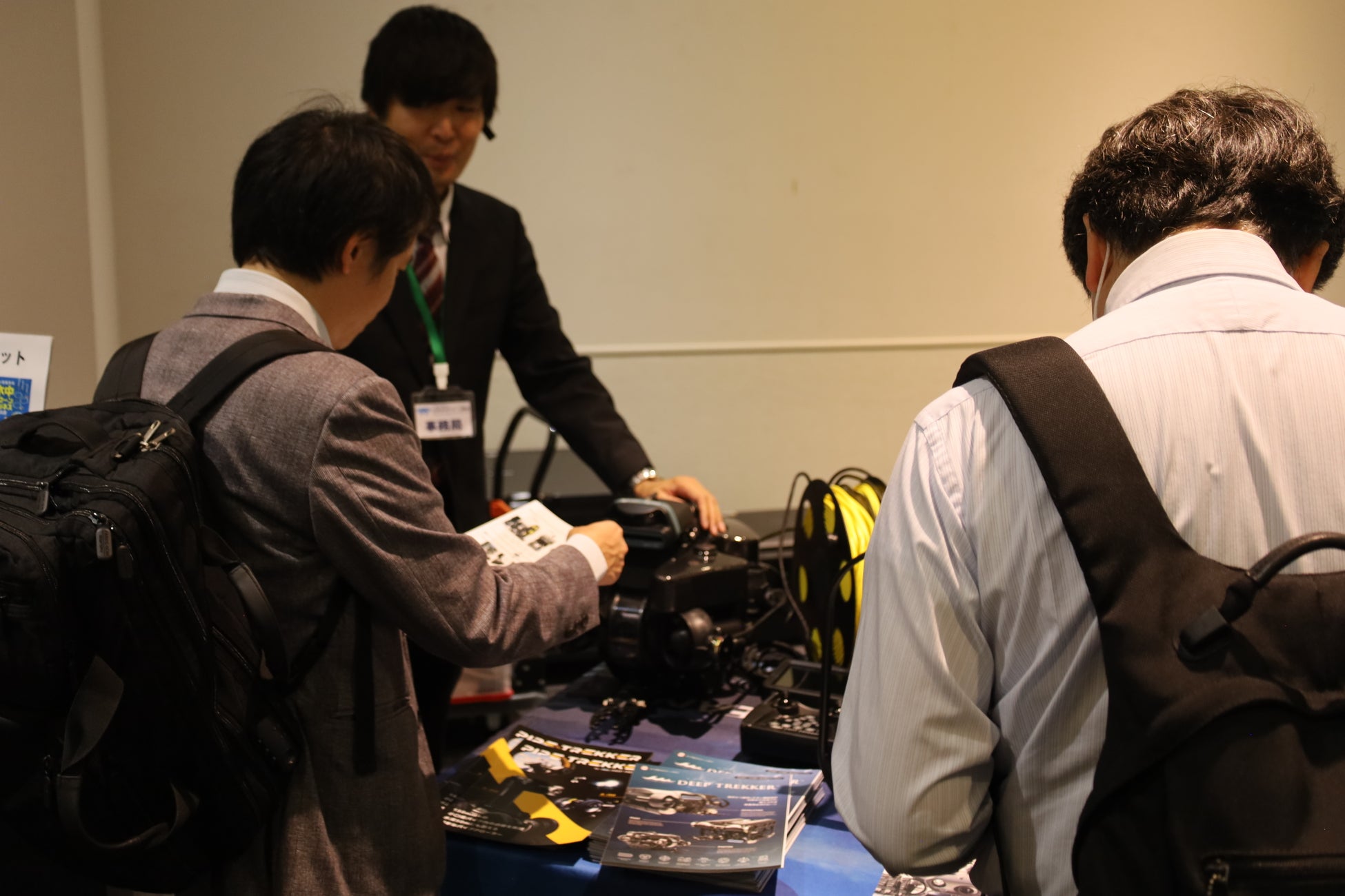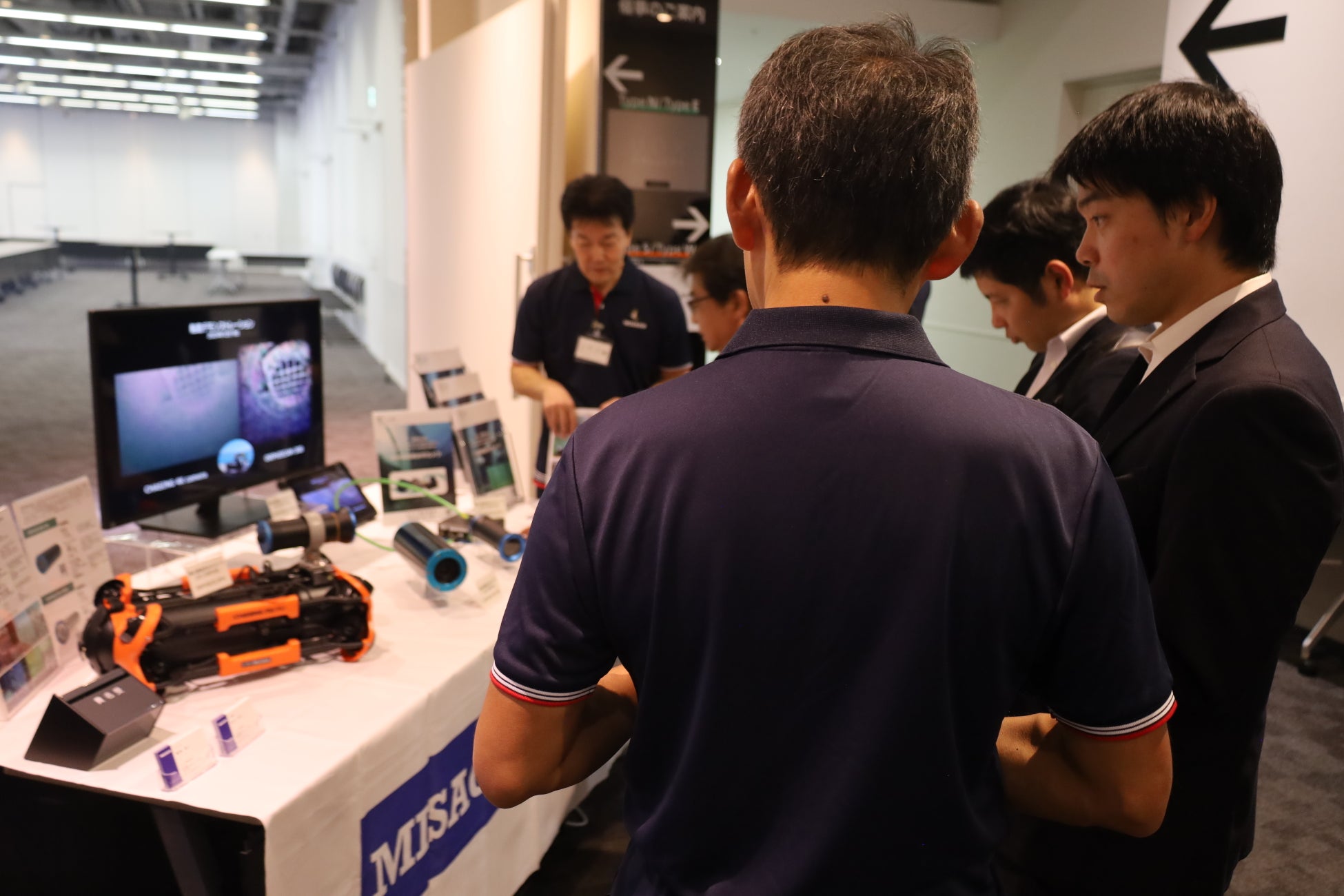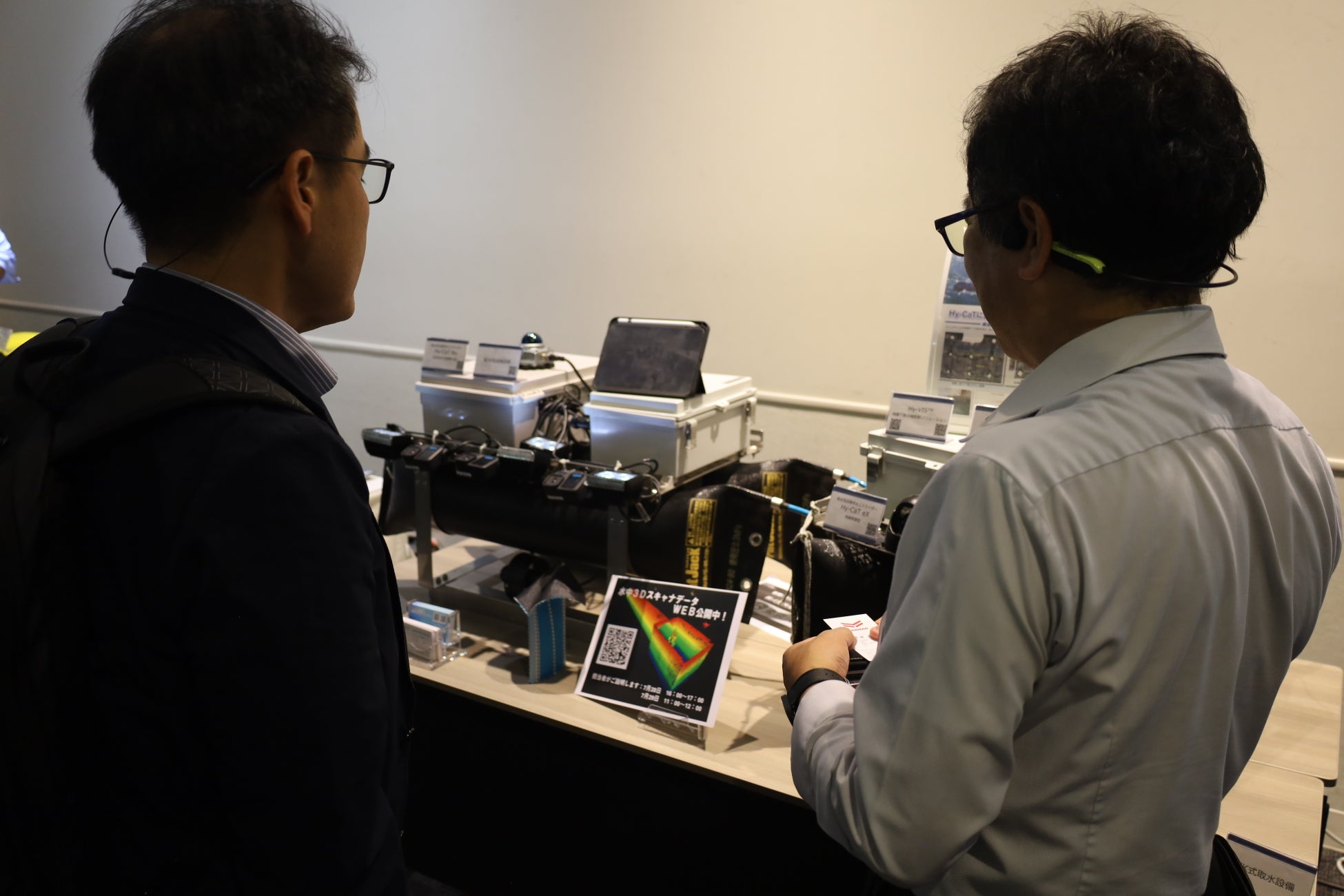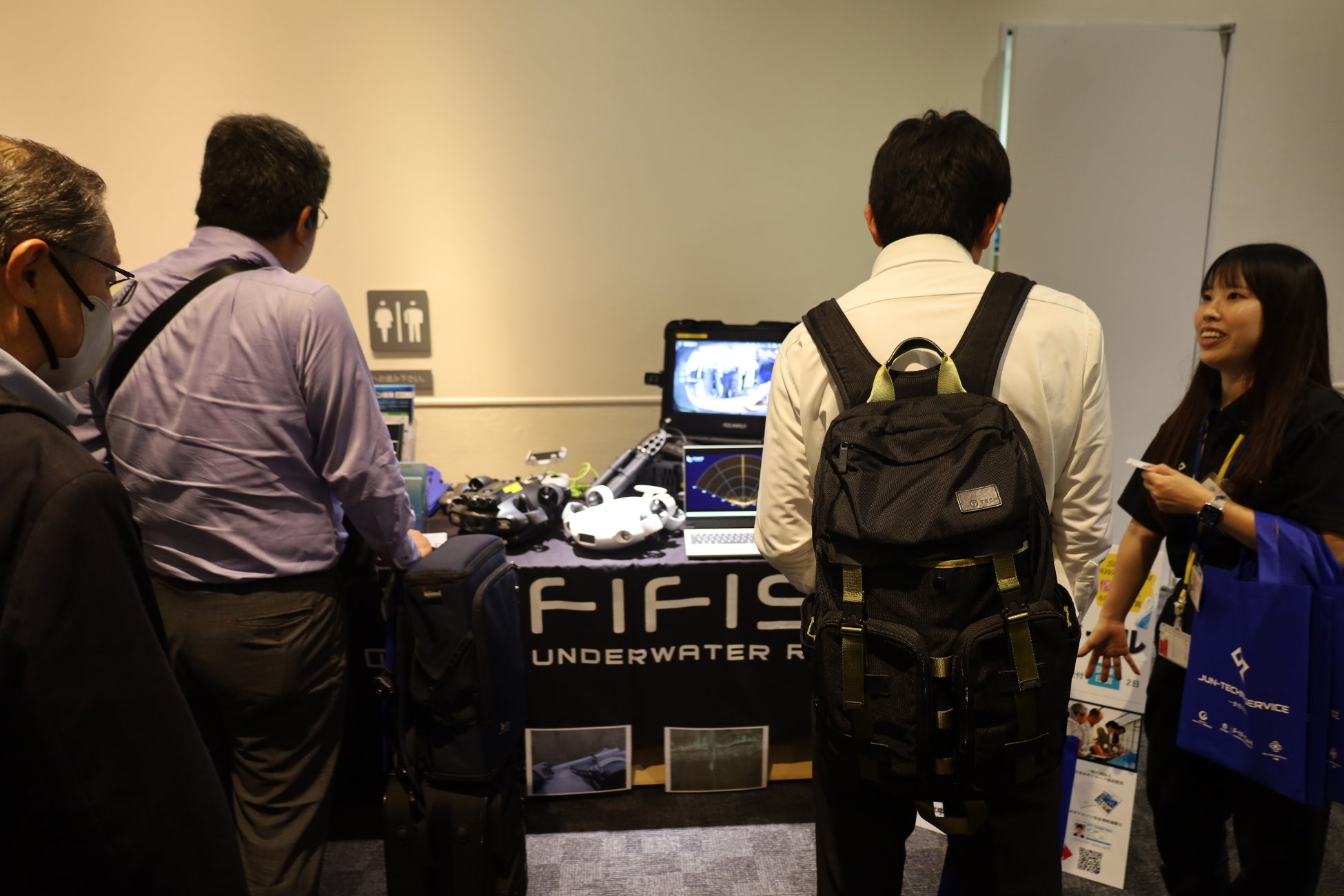 会場ロビーには協賛企業として、株式会社ジュンテクノサービス、JOHNAN株式会社、株式会社東京久栄、ミサゴ株式会社、株式会社スペースワンの5社がブースを出展。最新の水中ドローン機体、水上スライダー、最新の撮影・計測機器などが展示され、来場者が熱心に質問や撮影を行うなど、終始活況を呈しました。
