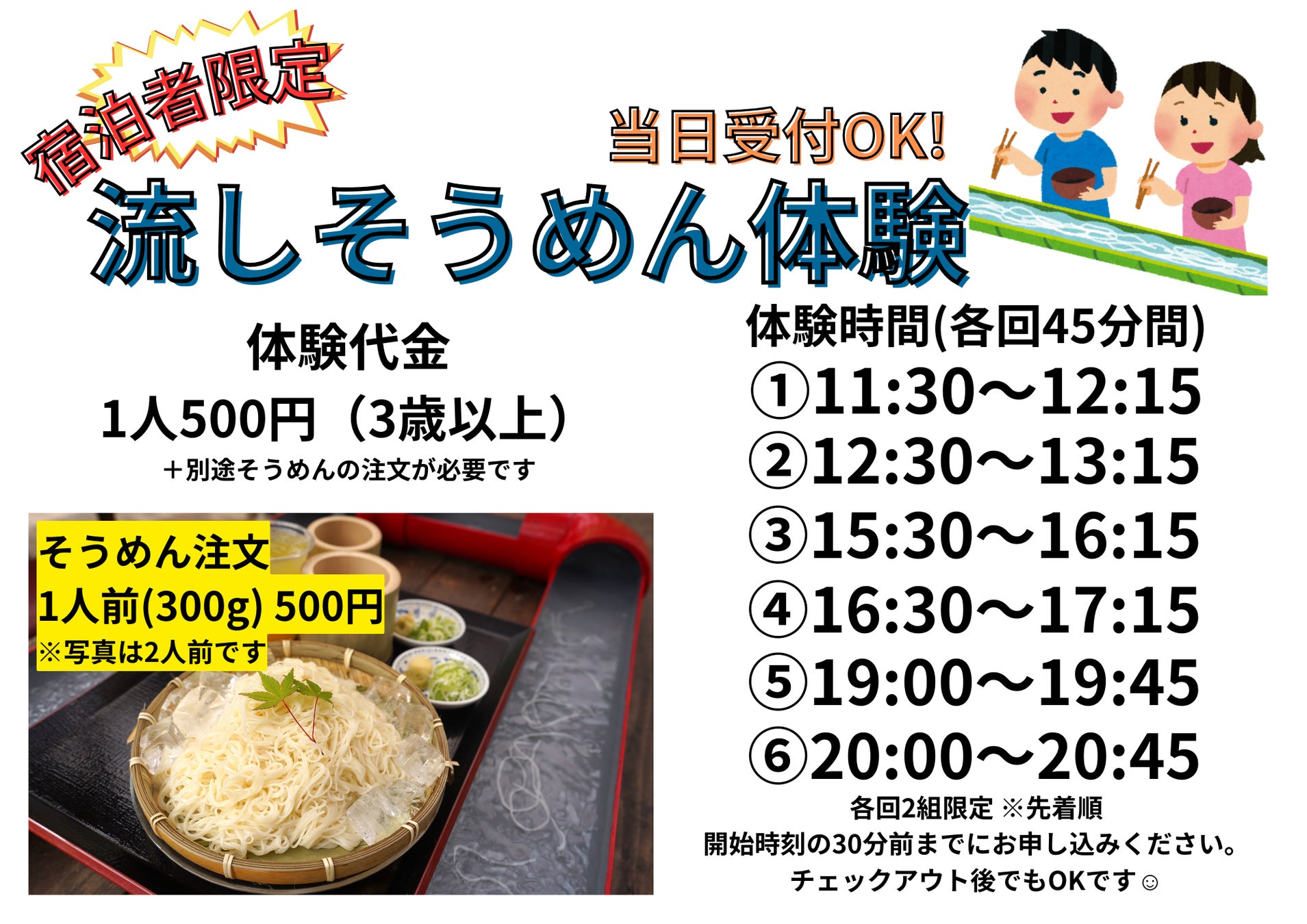 流しそうめん体験は1日6回行っており、各回2組限定です。