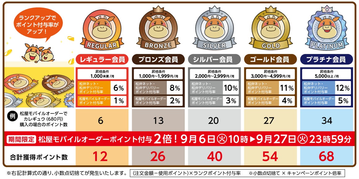 このたび松屋フーズ(本社:東京都武蔵野市、代表取締役社長:瓦葺一利)では、牛めし・カレー・定食・その他丼の「松屋」、とんかつ専門店の「松のや・松乃家」、カレー専門店の「マイカリー食堂」におきまして、券売機を使わずスマホで簡単キャッシュレス決済“松屋モバイルオーダー”にて導入いたしております松弁ポイントの「付与ポイント2倍キャンペーン」を9月6日(火)~9月27日(火)までの期間限定で開催いたします。