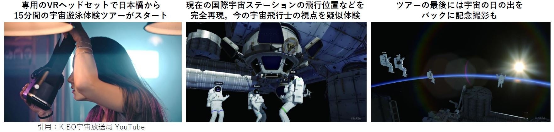 内容:JAXA監修による国際宇宙ステーション(ISS)を巡るデジタルツインメタバースを、VRヘッドセットを着用し体験いただけます。地上400kmを秒速約7.7kmで飛行しているISSの現在の飛行位置や昼夜をシミュレーションしており、今まさにISSにいる宇宙飛行士の視点を擬似的に体験することができます。独特の浮遊感が味わえる宇宙遊泳を楽しみながら、ツアー形式でISSを巡ります。ツアーの最後には宇宙の日の出をバックに、瑠璃色に染まる地球を眺めながら記念撮影もいたします。