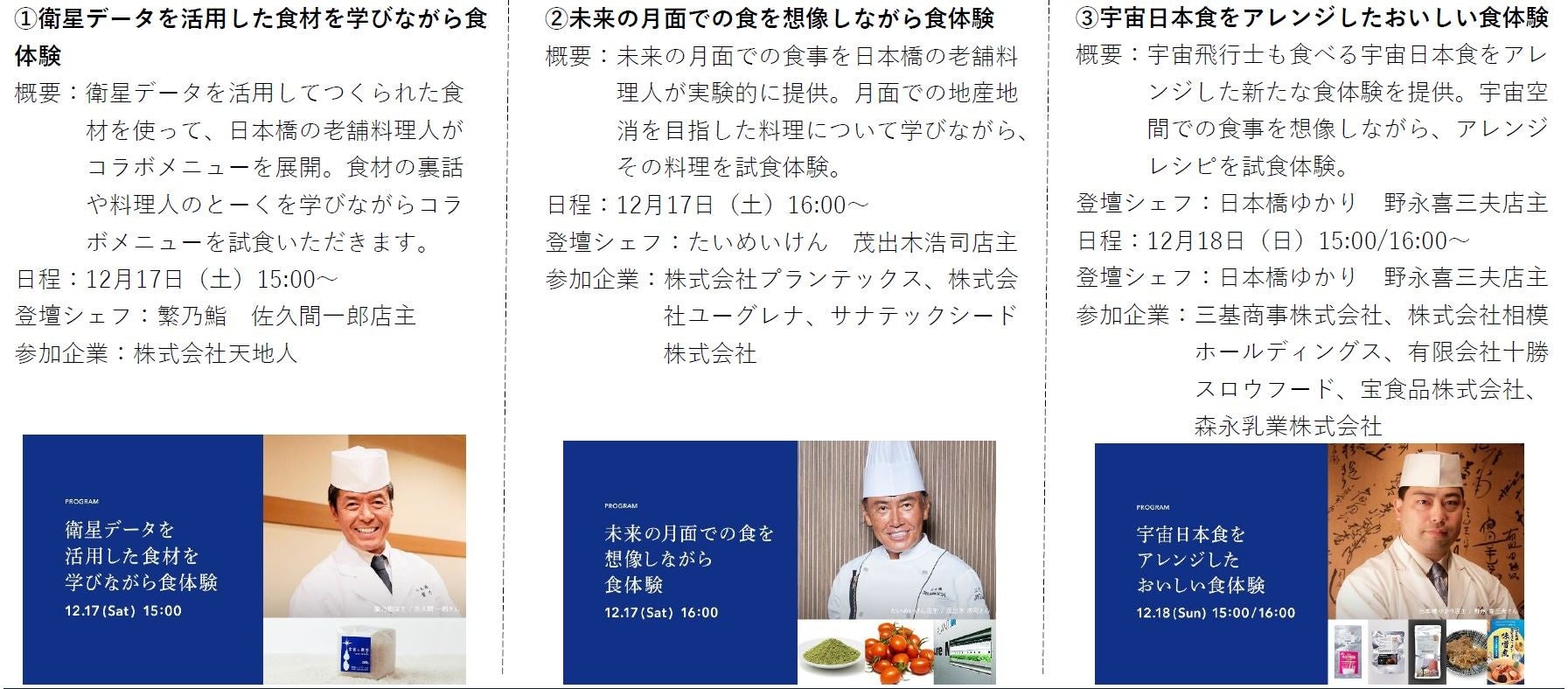内容:衛星データを活用した食材や宇宙食など、宇宙に関する食材を扱う企業と日本橋の老舗料理人のトークを交えた料理イベントを開催します。宇宙に関する食材を日本橋料理人が美味しくアレンジした料理を試食提供します。