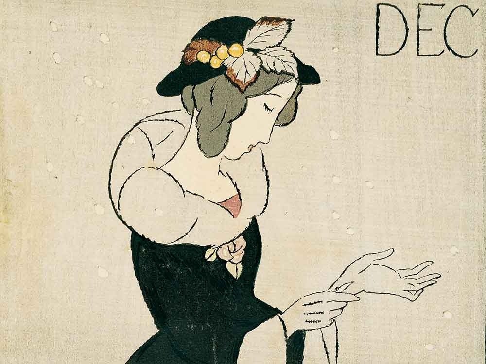 1924(大正13)年5月から1928(昭和3)年まで国際情報社から発行された女性向け雑誌「婦人グラフ」は、欧米の婦人雑誌「ガゼット・デュ・ボン・トン」や「レディースホーム・ジャーナル」などを手本に作られ、写真を多く用いて最先端のファッションや生活情報を発信しました。表紙や口絵、挿絵などの多くは機械刷りの木版画が別刷りで貼り込まれた贅沢な仕様で、夢二は本作を含めた18冊の表紙と本文や挿絵などの一部も手掛けました。《雪の風》は1924(大正13)年発行の第1巻第8号の表紙絵で、飾り付きの帽子にコートや手袋など当時はまだ珍しかった洋装でモダンな冬のファッションが描かれています。