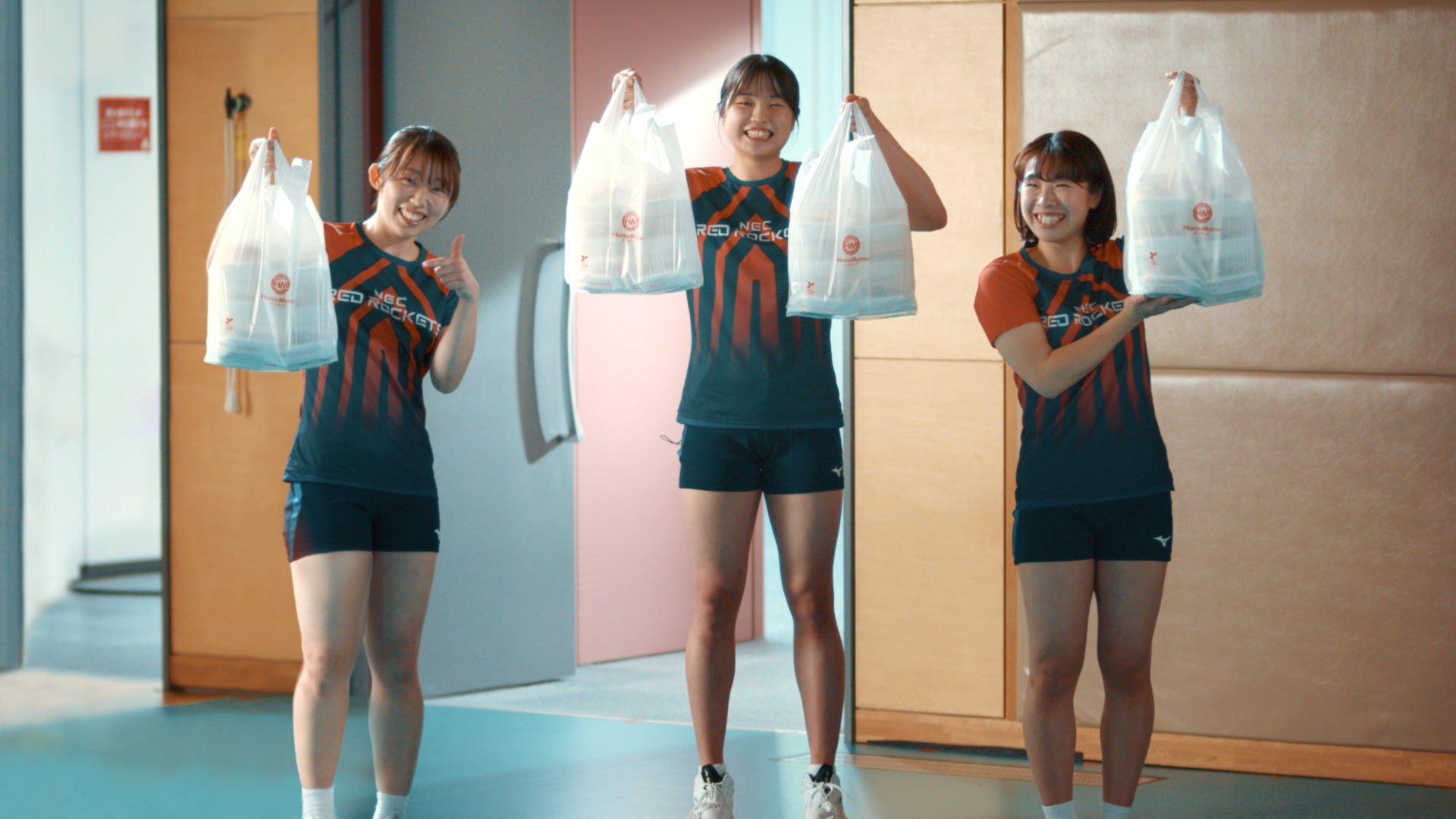 撮影はNECレッドロケッツの選手やコーチの方にもご協力いただき、練習場の玉川アリーナで行いました。サーブやレシーブなど、試合さながらの迫力のある練習風景を撮影。終始、和やかな雰囲気での撮影でしたが、カメラが回ると練習に集中する姿はトップアスリートならではのものでした。『チキン南蛮弁当』を食べるシーンの撮影では、チームメイトの皆さんとリラックスした表情で楽しく食事をする古賀選手の表情が印象的でした。