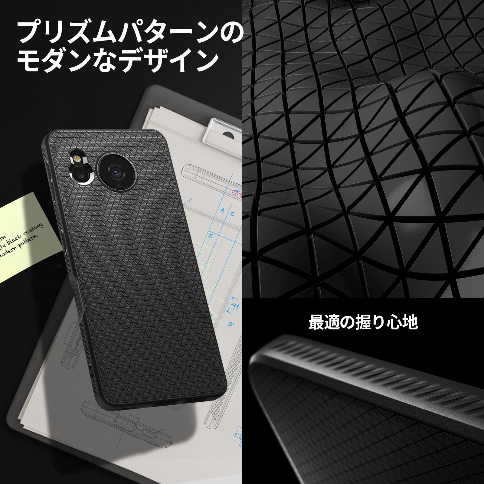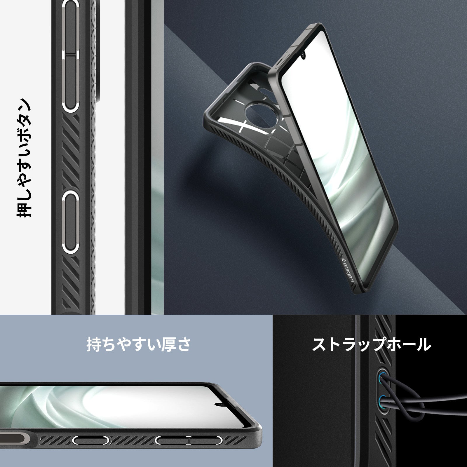 三つ、マットで滑りにくい表面にストラップホールまで、ユーザー目線で工夫したケース