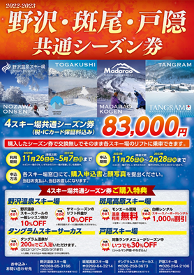 タングラムスキーサーカス(⻑野県信濃町 統括総支配人:小杉正行 以下「タングラム」)は、⻑野県北部に位置する野沢温泉スキー場(代表取締役社⻑:⽚桐幹雄)、斑尾⾼原スキー場(代表取締役:松下宏之)、⼾隠スキー場(代表取締役:徳武洋友)、タングラムの 4 スキー場で使用可能なリフト共通シーズン券を、9月15 日(木)より各スキー場の公式ホームページにて販売開始することをお知らせいたします。