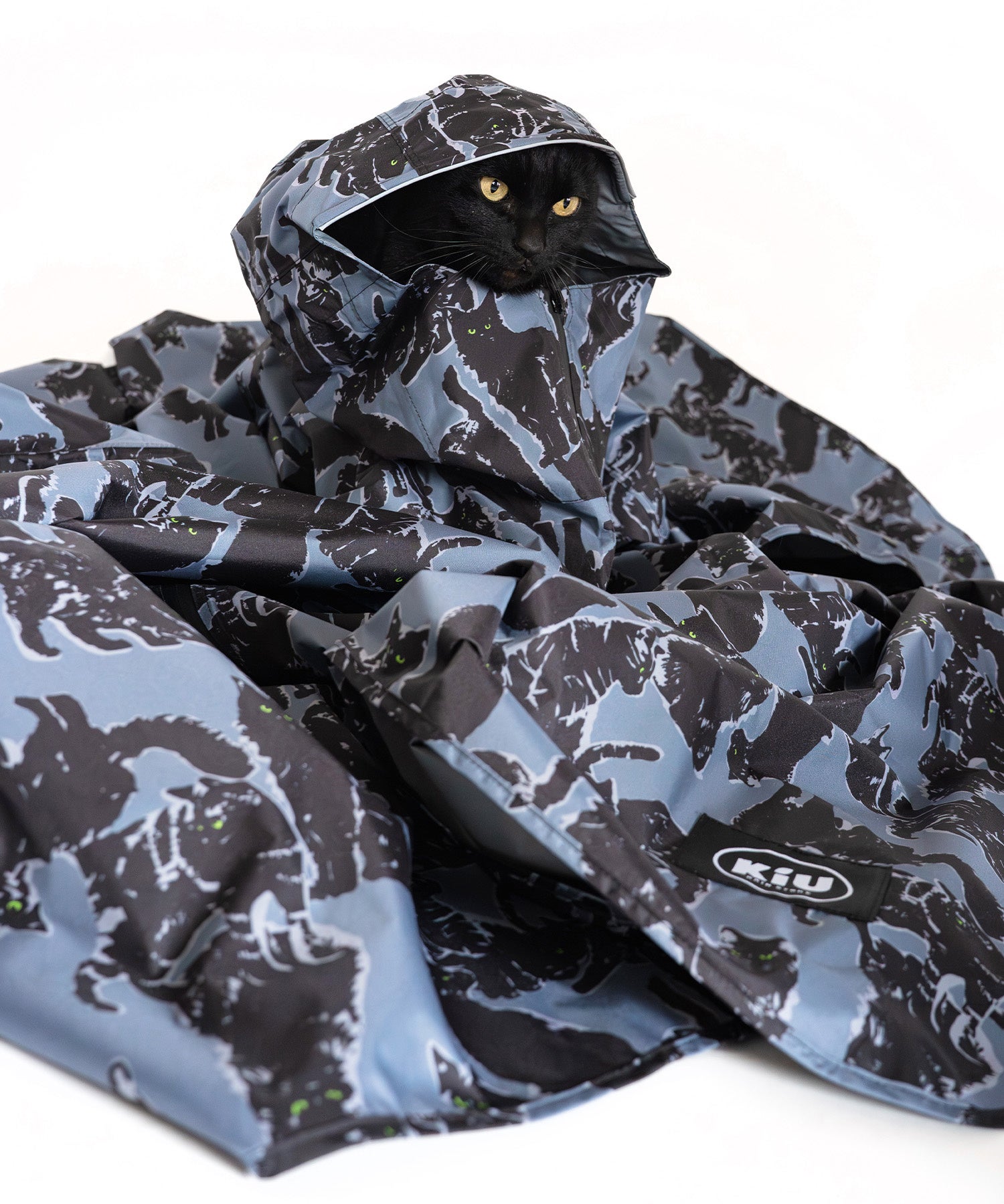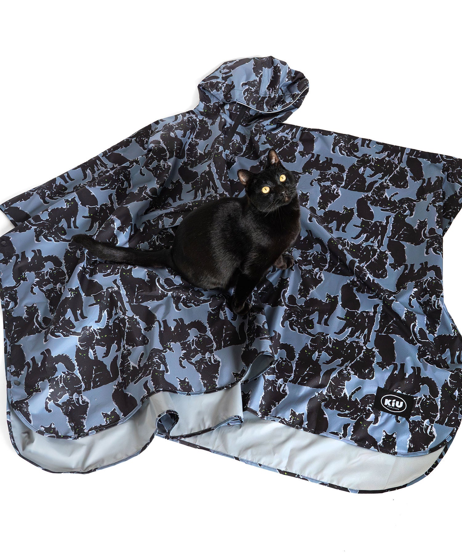 落ち着いたブルーグレーの生地に、印象的なグリーンアイの黒猫たちを描いた「ミッドナイトキャッツ」。大人の装いにも自然になじむシックなデザインと、KiUならではの撥水・防水機能を備えたアイテム展開で、雨の日にもいつもの日にも取り入れやすいコレクションに仕上げました。