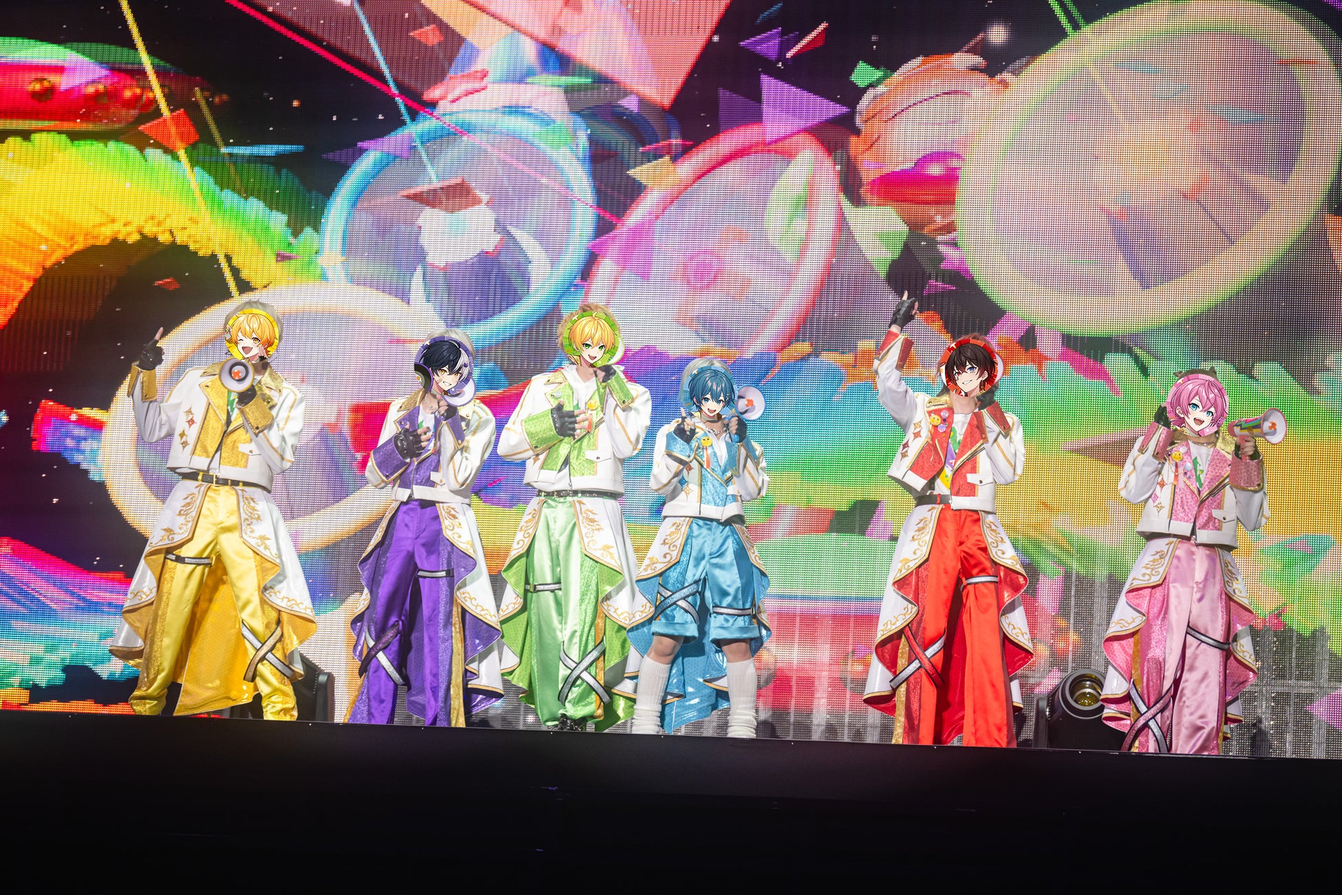 『AMPTAKxレインボーロード中77%』のキービジュアルそのまま、それぞれのメンバーカラーをあしらった華やかな白衣装に身を包んだ6人が拡声器を手に歌って踊る1曲目は、「AMPTAKxレインボーロード中77%」。虹のようなカラフルなライティングも味方につけ、映像とシンクロした楽しいパフォーマンスで宇宙でも相変わらず賑やかにリスナーを巻き込んでいく6人は、<ってことで地球に帰りまーす>と宣言してステージ下段へ。