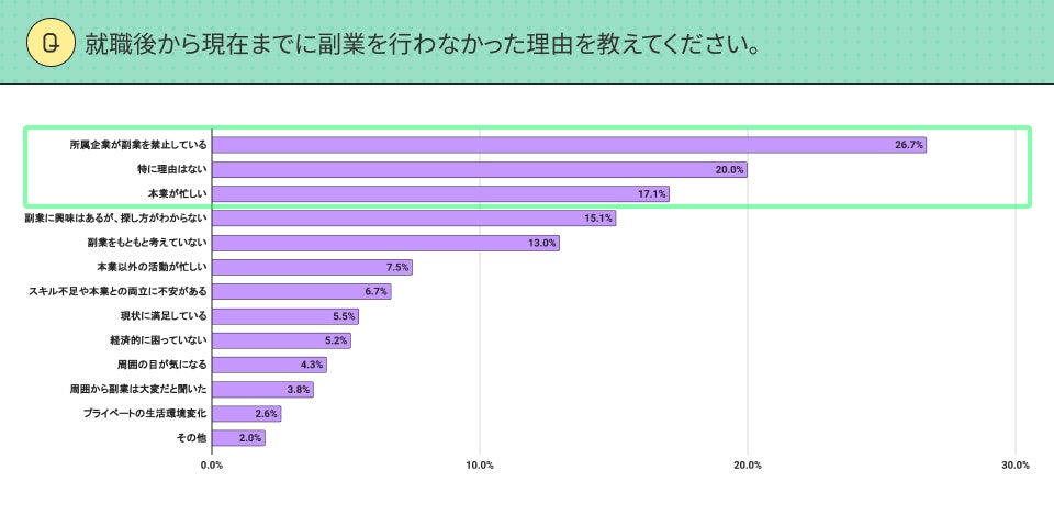 新卒・第二新卒のうち、副業経験が「ない」と答えた回答者に、副業を実施しなかった理由について尋ねたところ、1位は「所属企業が副業を禁止しているため」(26.7%)、2位は「特に理由はない」(20.0%)、3位は「本業が忙しいため」(17.1%)となりました。まだまだ副業を禁止している企業が多いことが分かります。