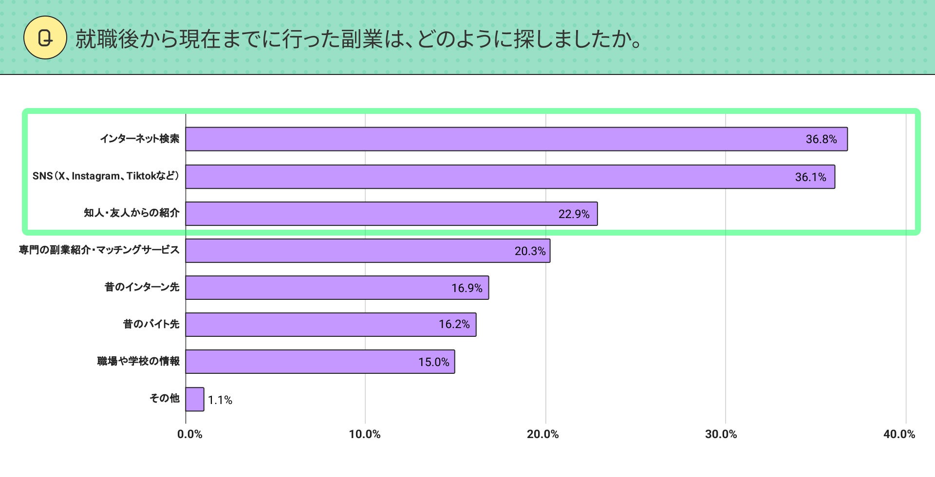 また、副業経験が「ある」と答えた回答者に、副業はどのように探したかを尋ねたところ、1位は「インターネット検索」(36.8%)、2位は「SNS」(36.1%)、3位は「知人・友人からの紹介」(22.9%)となり、デジタルネイティブ世代らしい回答にも見えました。