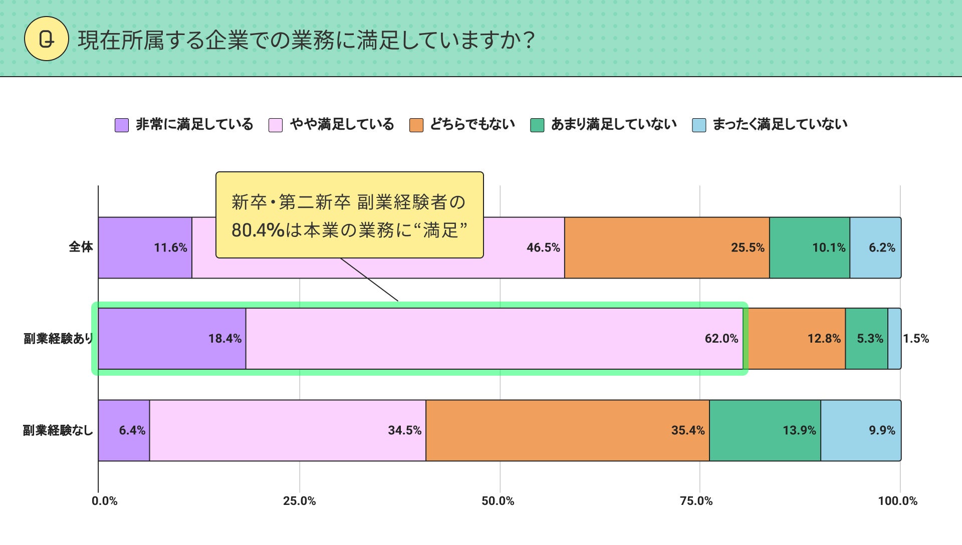 続いて、副業との関連を見てみると、副業経験が「ある」と回答した新卒・第二新卒の80.4%が、所属企業での業務に満足しているということも分かりました。