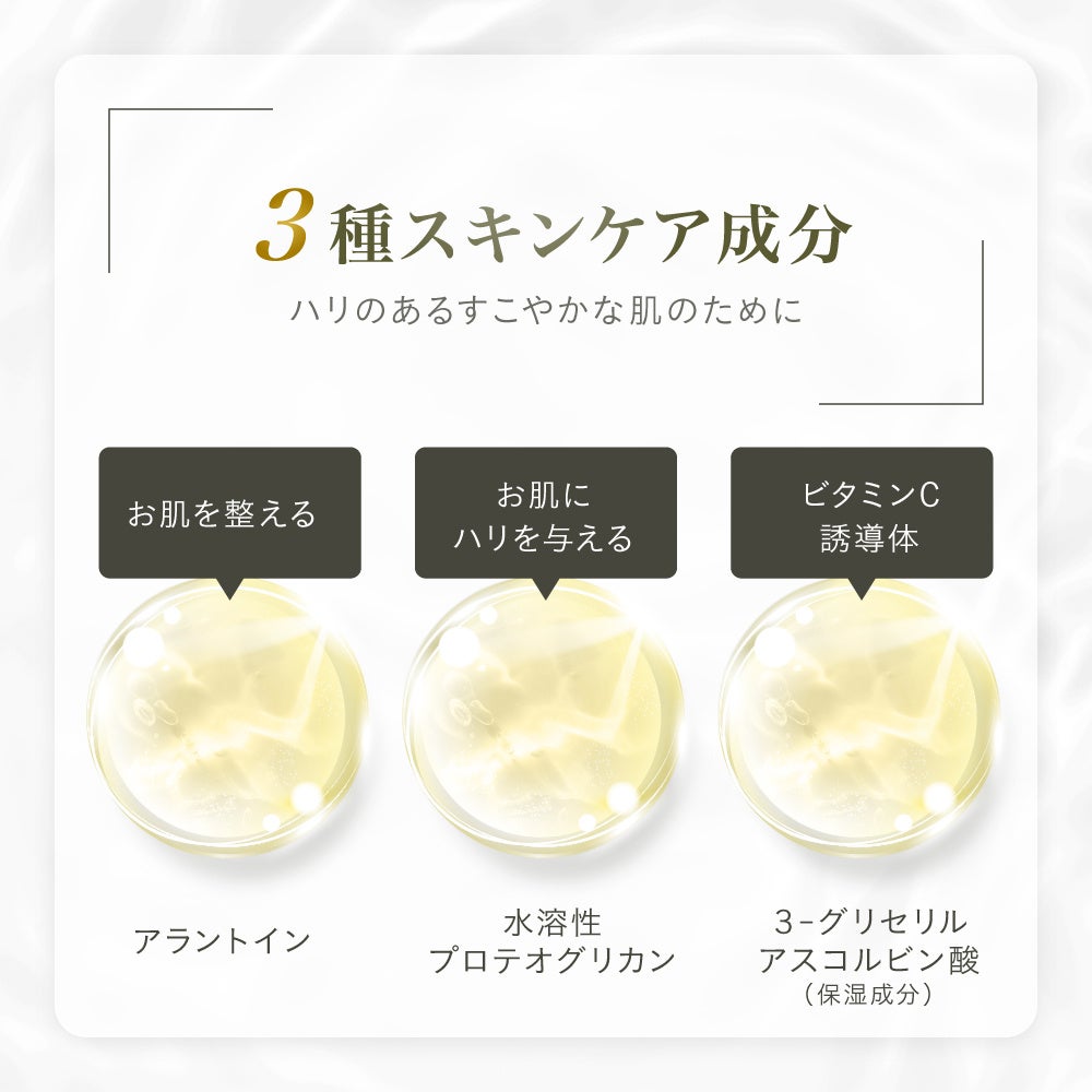 ハリのあるすこやかな肌のために、アラントイン(肌を整える)、水溶性プロテオグリカン(保湿成分)、3-グリセリルアスコルビン酸(ビタミンC誘導体・整肌成分)を配合。