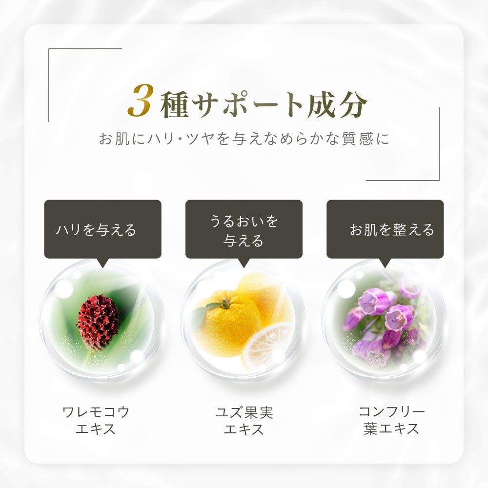 ワレモコウエキス(ハリ感をサポート)、ユズ果実エキス(保湿成分)、コンフリー葉エキス(肌を整える)が、なめらかな肌印象へと整えます。