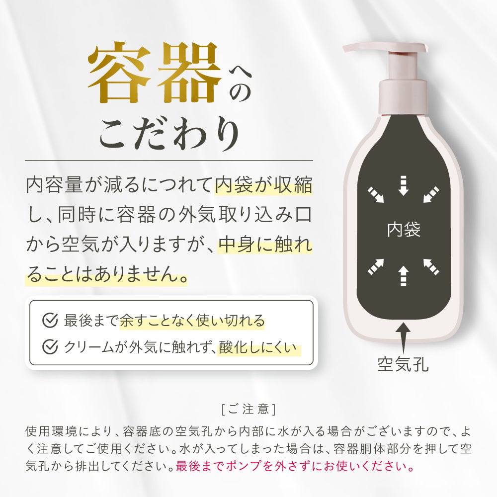 容器は、内容量が減るごとに内装が収縮する構造で、中身が空気に触れることがなく、酸化しにくい構造をしています。