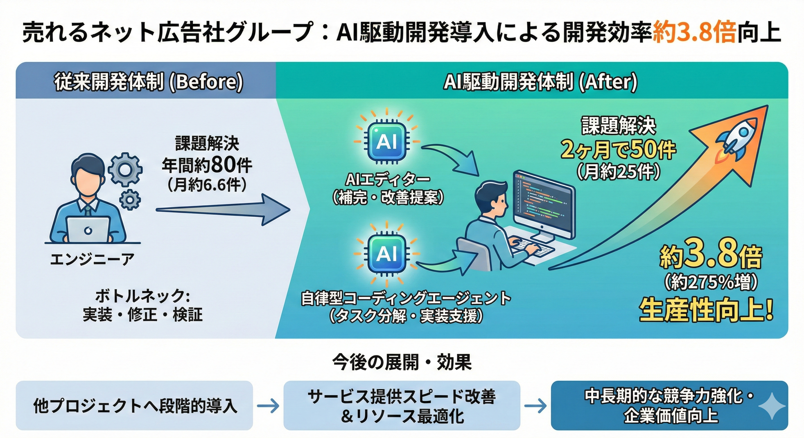 これは、従来比で約3.8倍、約275%の生産性向上に相当し、AIを前提とした開発プロセスが、実務レベルにおいても十分に有効であることを示す結果となっております。