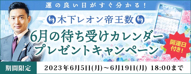 フジテレビ系列で放送中の占い番組『突然ですが占ってもいいですか?』で人気を博している木下レオン。ただいま、月額公式サイト『木下レオン◆帝王数』にて、『6月の待ち受けカレンダープレゼント』キャンペーンを開催中です。期間中、対象の占いメニュー購入で、その月の開運日がひと目で分かるオリジナル待ち受けカレンダーがついてくるお得なキャンペーンとなっております。ぜひこの機会にお試しください。