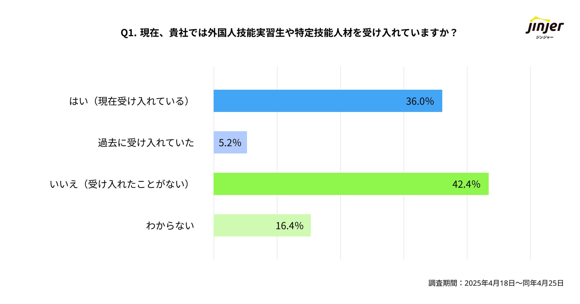 外国人技能実習生や特定技能人材を受けて入れている企業は36%