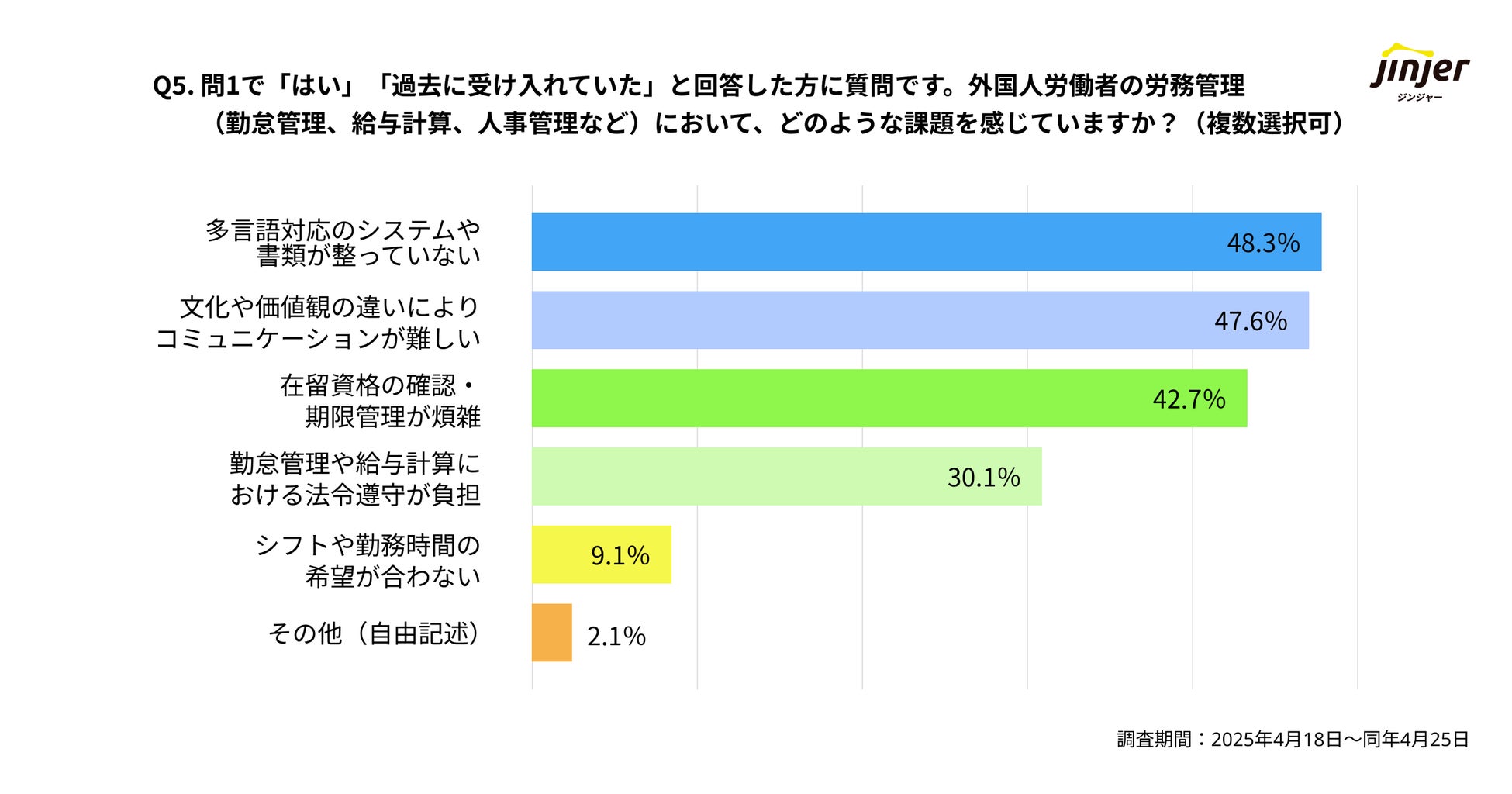 外国人労働者の労務管理における課題について質問したところ、最も多い意見は「多言語対応のシステムや書類が整っていない(48.3%)」でした。次いで、「文化や価値観の違いによりコミュニケーションが難しい(47.6%)」「在留資格の確認・期限管理が煩雑(42.7%)」という結果になりました。