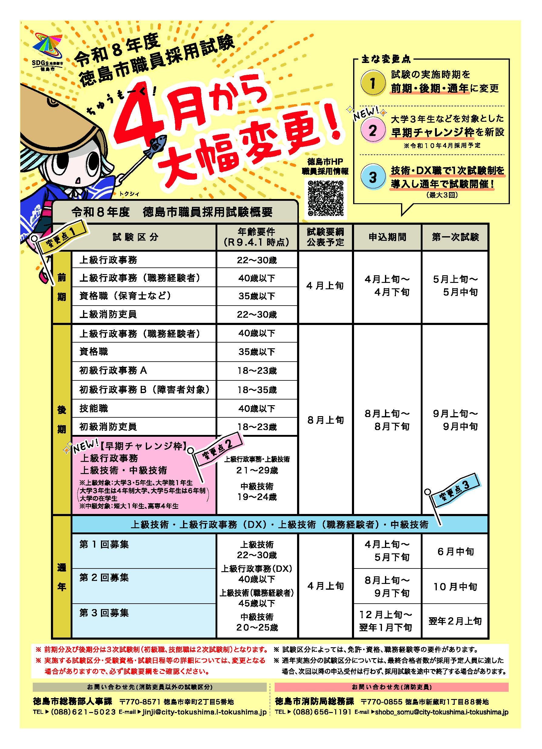 徳島市では、令和8年度から職員採用試験の実施方法を見直し、公務員志望者のほか、転職を検討されている方など、より多くの方に受験いただけるよう、職員募集を4月から開始するほか、大学3年生などを対象とした試験区分を新設するなど、次のとおり変更を行います。詳しくは、本市ホームページまたは今後公表される試験要綱でご確認ください。