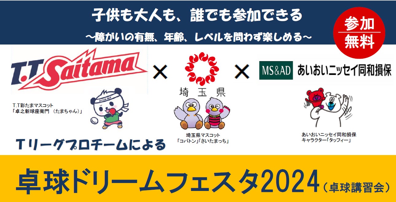 埼玉県では、プロ卓球チーム・T.T彩たま株式会社及びあいおいニッセイ同和損害保険株式会社と連携し、卓球講習会を8月31日(土曜日)に開催します!