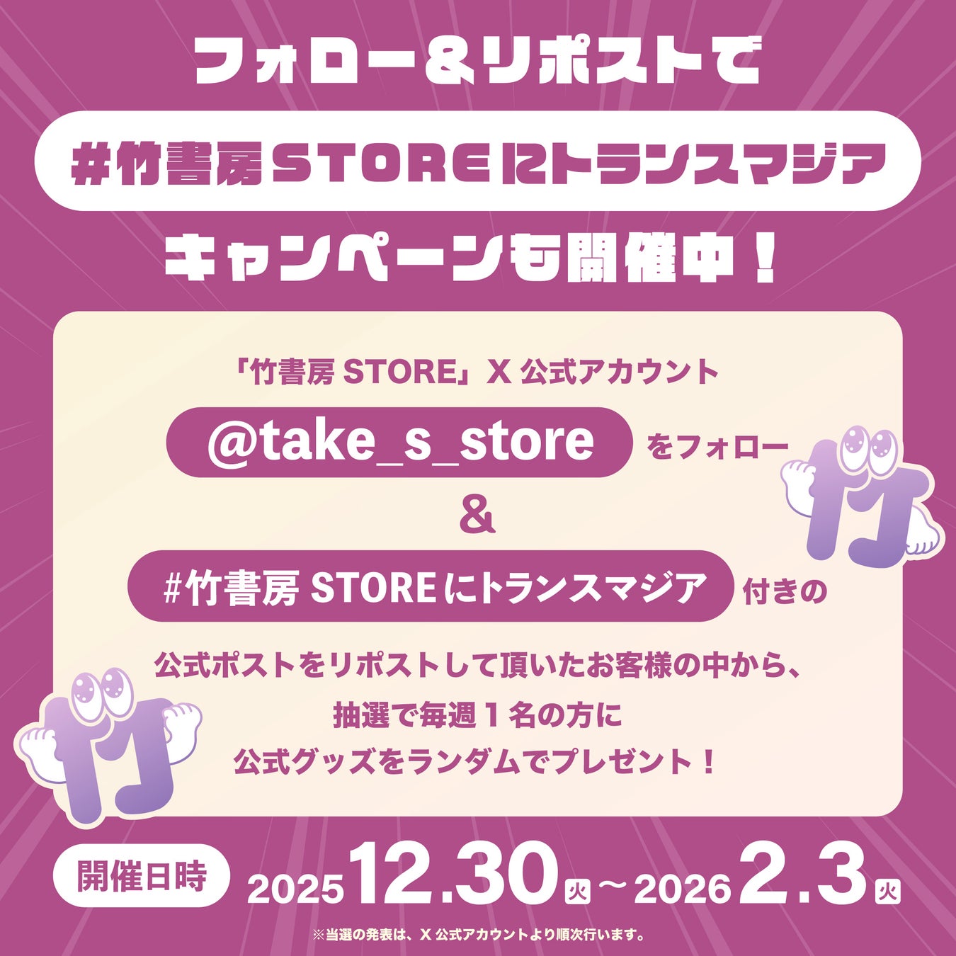 2025年12月30日(火)から2026年2月3日(火)までの期間に「竹書房STORE」X公式アカウント @take_s_store をフォロー& 「#竹書房STOREにトランスマジア」付きの公式ポストをリポストして頂いたお客様の中から、抽選で毎週1名の方に公式グッズをランダムでプレゼント!