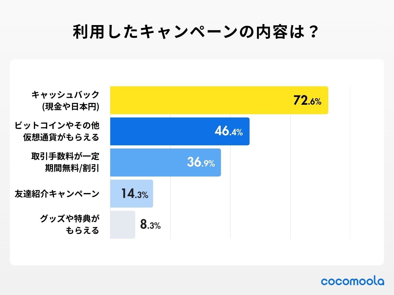 ・キャンペーンを「利用した」と回答した人は45.9%で、全体の約半数が活用経験あり。中でも「キャッシュバック(現金や日本円)」(72.6%)が最も利用されたキャンペーン内容となった。