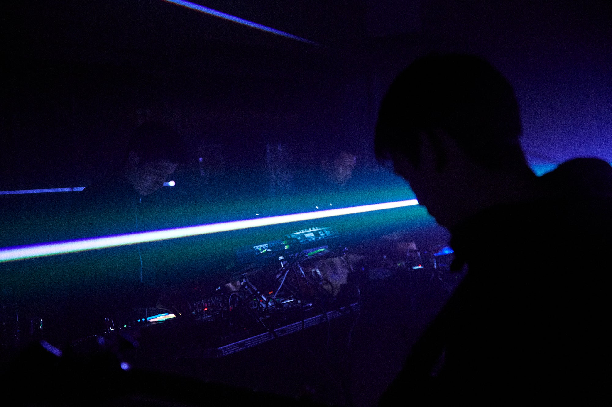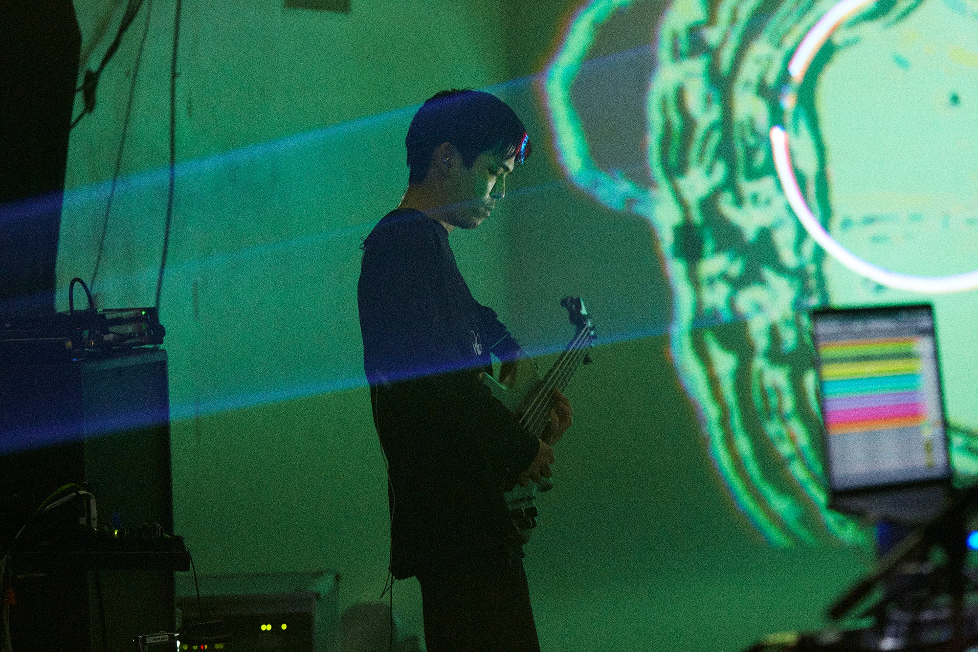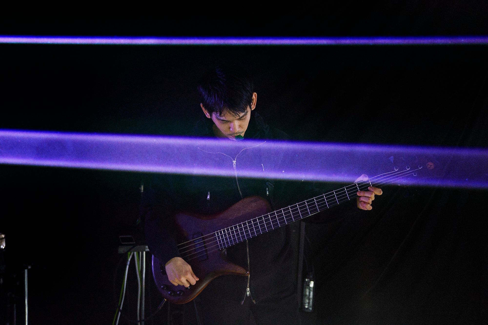 「Fallen Angle」は、『NO MOON』の中でも一際アグレッシヴなナンバー。ケモノの鳴き声をミックスした不穏なシンセをバックに、歌心たっぷりのベースと櫻木の弾くアンビエントなエレキギターが混じり合う。スモークの焚かれた真っ暗な空間をいく筋ものレーザー光線が切り裂いていく、映像作家Ryuichi Onoの演出も圧巻だった。