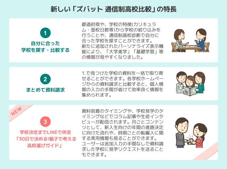 「ズバット 通信制高校比較」では資料請求前の学校探し・学校比較から、資料請求、その後の学校検討のフェーズまでユーザー支援を行います。