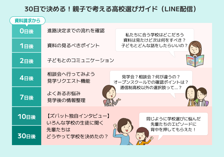 資料請求後に公式LINEアカウントに登録することで、「30日で決める!親子で考える高校選びガイド」を受け取ることができます。
