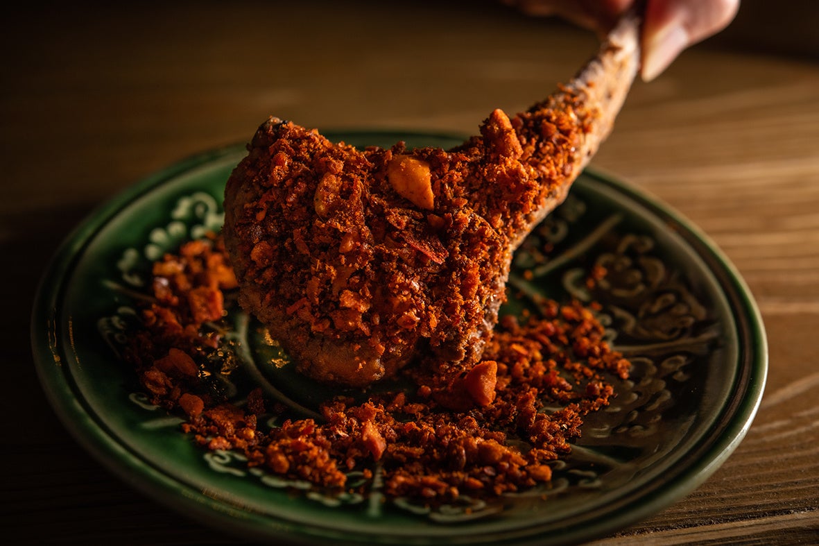 甘辛ダレに付けたラム肉を揚げて、オリジナルスパイスをたっぷりとまぶしています。(600円)